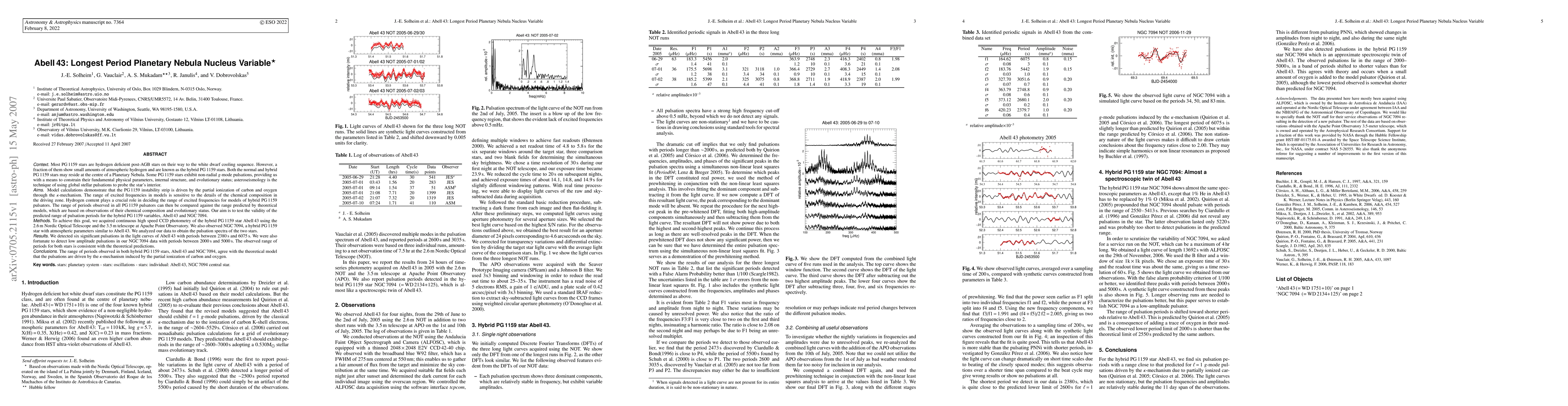 The study observed Abell 43, a hybrid PG 1159 star, revealing 6 significant pulsations with periods ranging from 2380s to 6075s over 24 hours. Similarly, NGC 7094's central star showed 3 low-amplitude pulsations between 2000s and 5000s in a 4-hour observation. These findings align with theoretical predictions of g-mode pulsations caused by the kappa-mechanism resulting from partial ionization of carbon and oxygen.