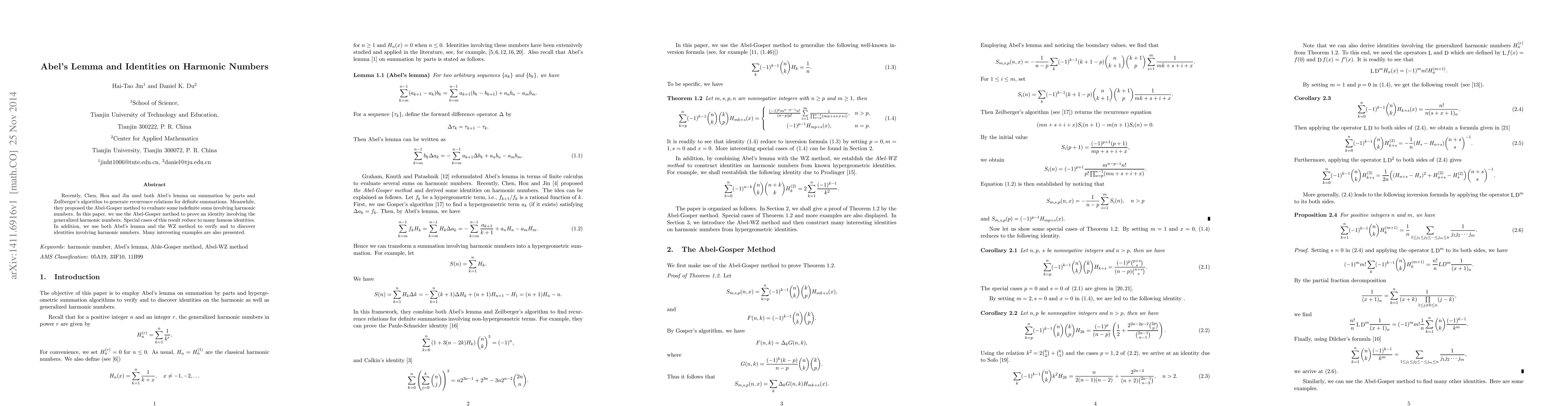 Recently, Chen, Hou and Jin used both Abel's lemma on summation by parts and Zeilberger's algorithm to generate recurrence relations for definite summations. Meanwhile, they proposed the Abel-Gosper method to evaluate some indefinite sums involving harmonic numbers. In this paper, we use the Abel-Gosper method to prove an identity involving the generalized harmonic numbers. Special cases of this result reduce to many famous identities. In addition, we use both Abel's lemma and the WZ method to verify and to discover identities involving harmonic numbers. Many interesting examples are also presented.