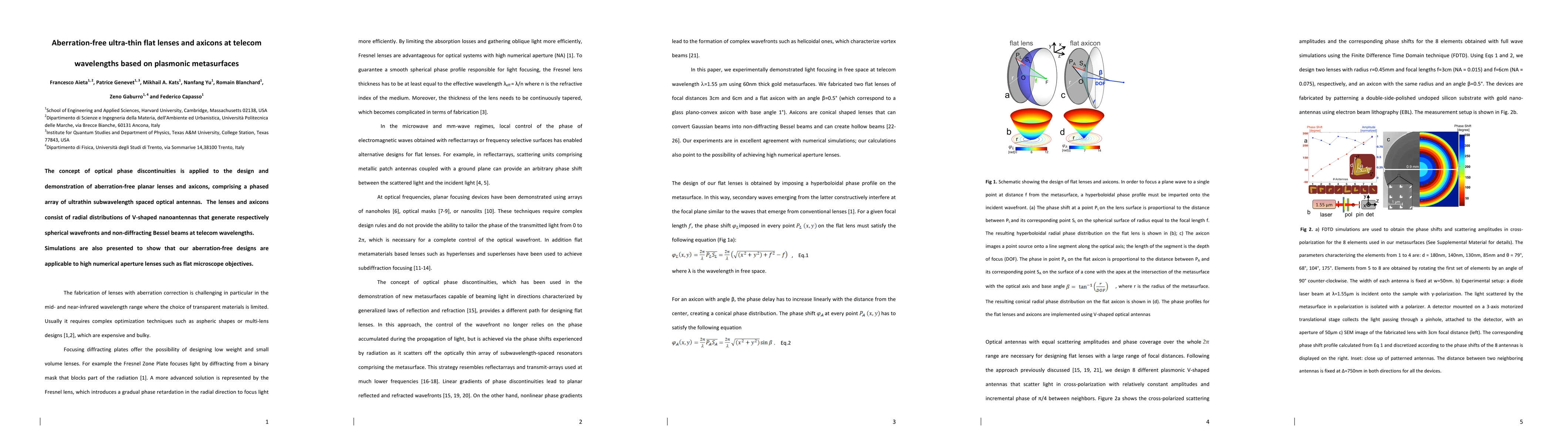 This paper presents aberration-free ultra-thin lenses and axicons based on plasmonic metasurfaces using optical phase discontinuities. The design employs a phased array of V-shaped nanoantennas to generate spherical wavefronts and Bessel beams at telecom wavelengths, with simulations demonstrating their applicability to high numerical aperture lenses.