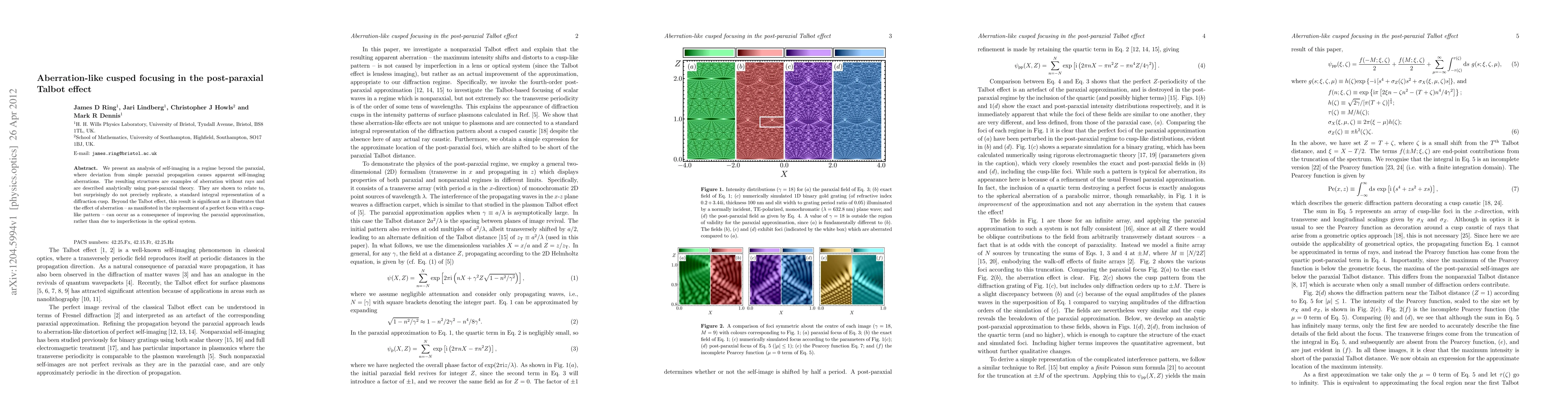 We present an analysis of self-imaging in a regime beyond the paraxial, where deviation from simple paraxial propagation causes apparent self-imaging aberrations. The resulting structures are examples of aberration without rays and are described analytically using post-paraxial theory. They are shown to relate to, but surprisingly do not precisely replicate, a standard integral representation of a diffraction cusp. Beyond the Talbot effect, this result is significant as it illustrates that the effect of aberration -- as manifested in the replacement of a perfect focus with a cusp-like pattern -- can occur as a consequence of improving the paraxial approximation, rather than due to imperfections in the optical system.