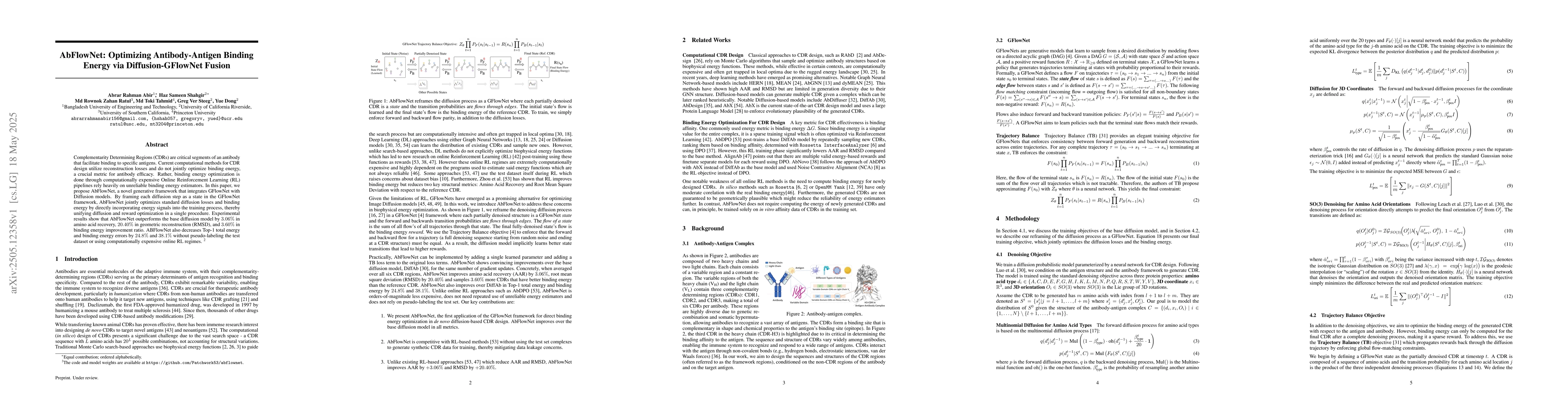 AbFlowNet optimizes antibody-antigen binding energy through a novel fusion of GFlowNet and Diffusion models, improving amino acid recovery, geometric reconstruction, and binding energy by 3.06%, 20.40%, and 3.60% respectively.