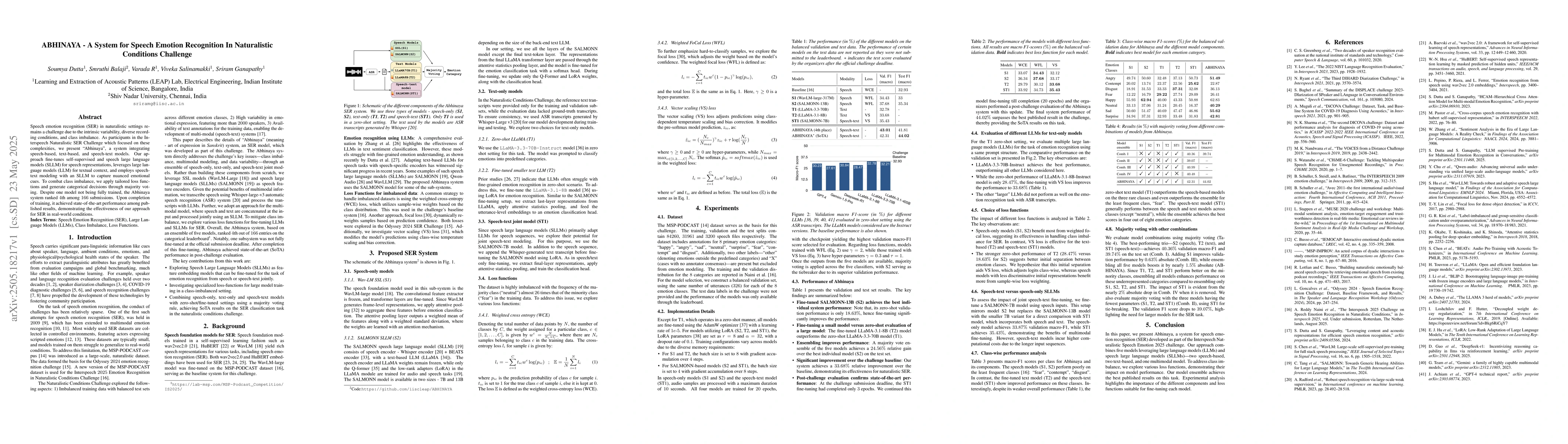 The research presents Abhinaya, a system for speech emotion recognition in naturalistic conditions, integrating speech-based, text-based, and speech-text models. It fine-tunes self-supervised and speech large language models (SLLM) for speech representations, uses large language models (LLM) for textual context, and employs speech-text modeling with an SLLM to capture emotional cues. Class imbalance is addressed via tailored loss functions and majority voting.