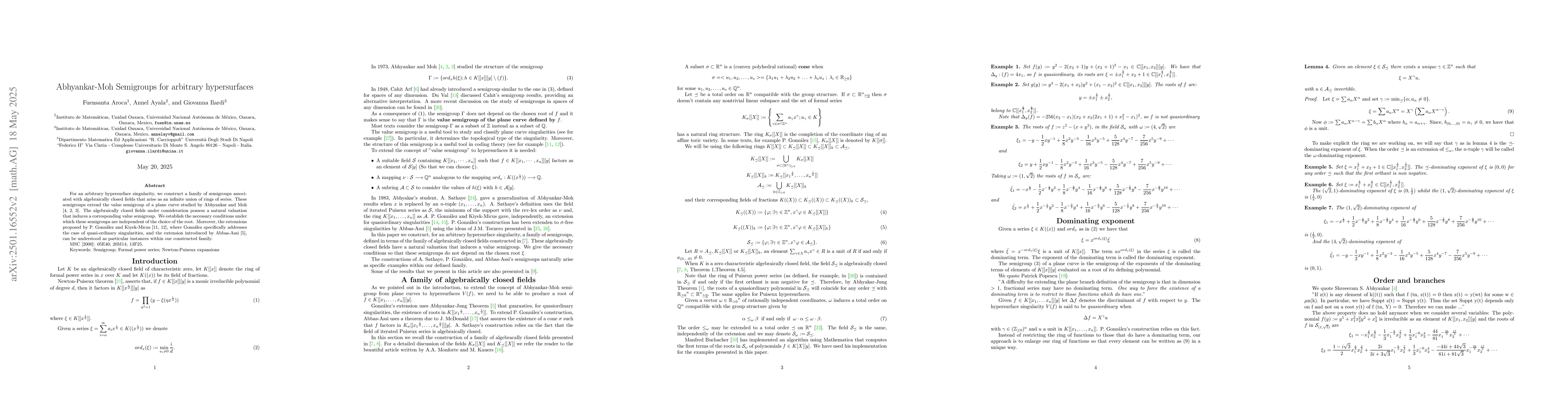 This paper constructs a family of semigroups for arbitrary hypersurface singularities, extending the value semigroup of plane curves studied by Abhyankar and Moh. It establishes conditions for these semigroups' independence from root choice and shows how extensions by other researchers fit within this framework.