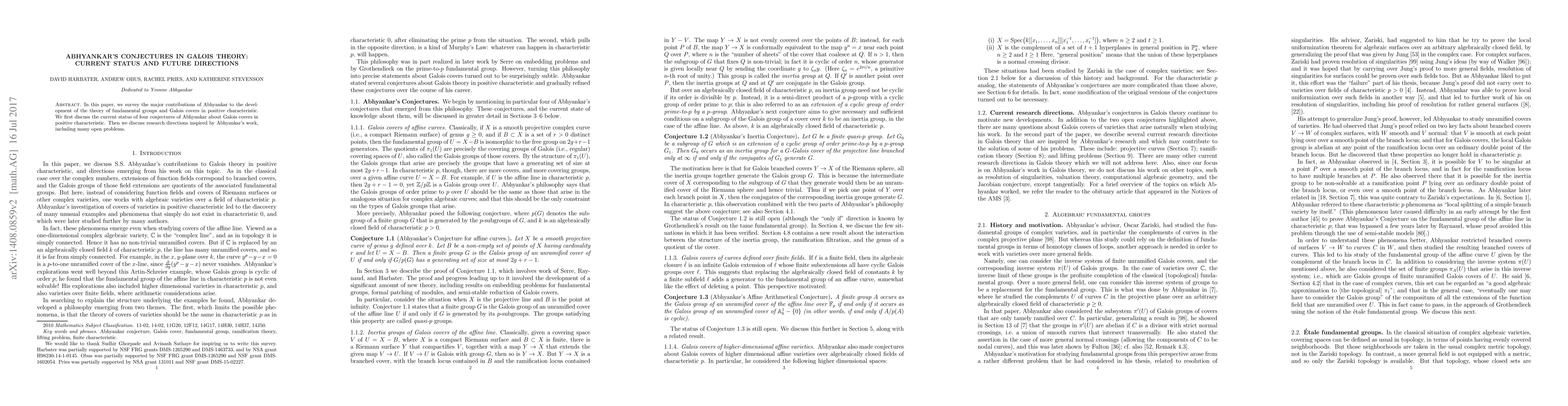 In this paper, we survey the major contributions of Abhyankar to the development of the theory of fundamental groups and Galois covers in positive characteristic. We first discuss the current status of four conjectures of Abhyankar about Galois covers in positive characteristic. Then we discuss research directions inspired by Abhyankar's work, including many open problems.