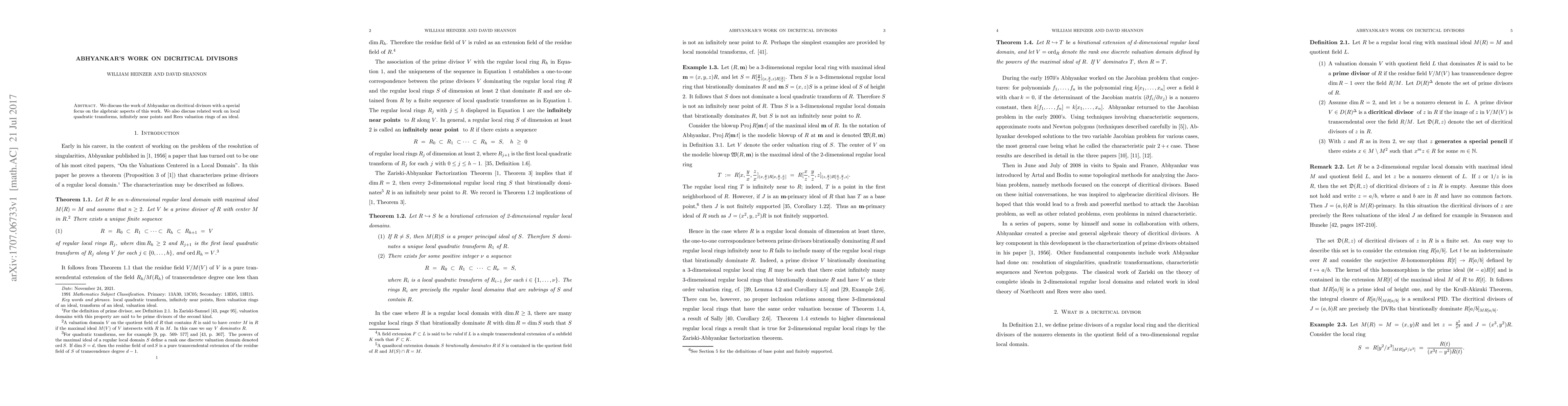 This paper discusses Abhyankar's work on dicritical divisors, exploring their algebraic properties and connections to local quadratic transforms, infinitely near points, and Rees valuation rings of an ideal.