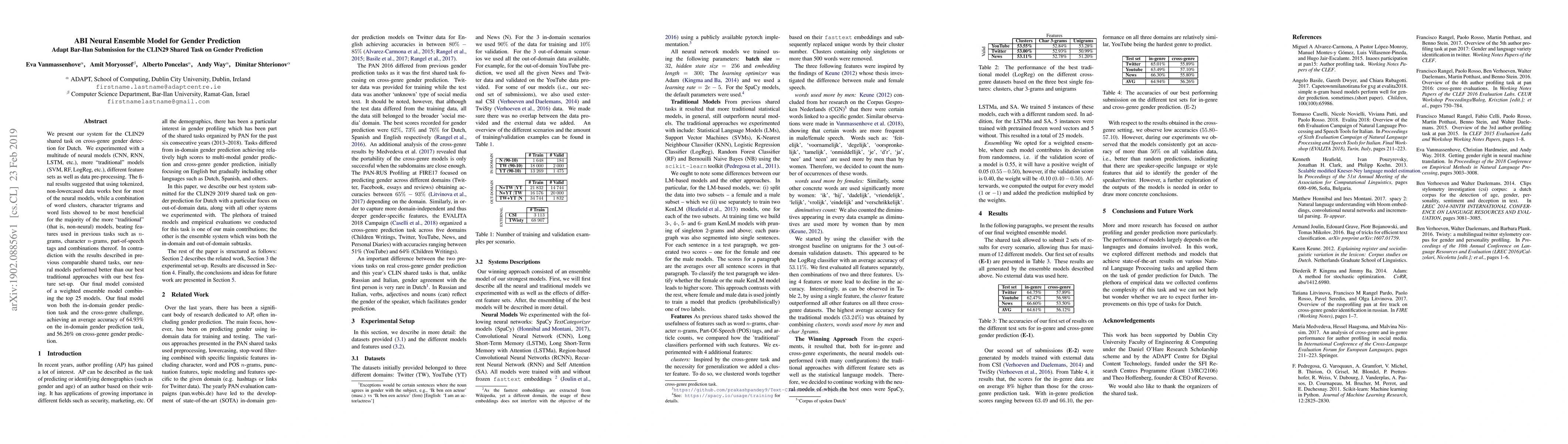 A new neural ensemble model outperformed traditional approaches in a gender prediction task for Dutch, achieving 64.93% accuracy on in-domain predictions and 56.26% on cross-genre challenges.