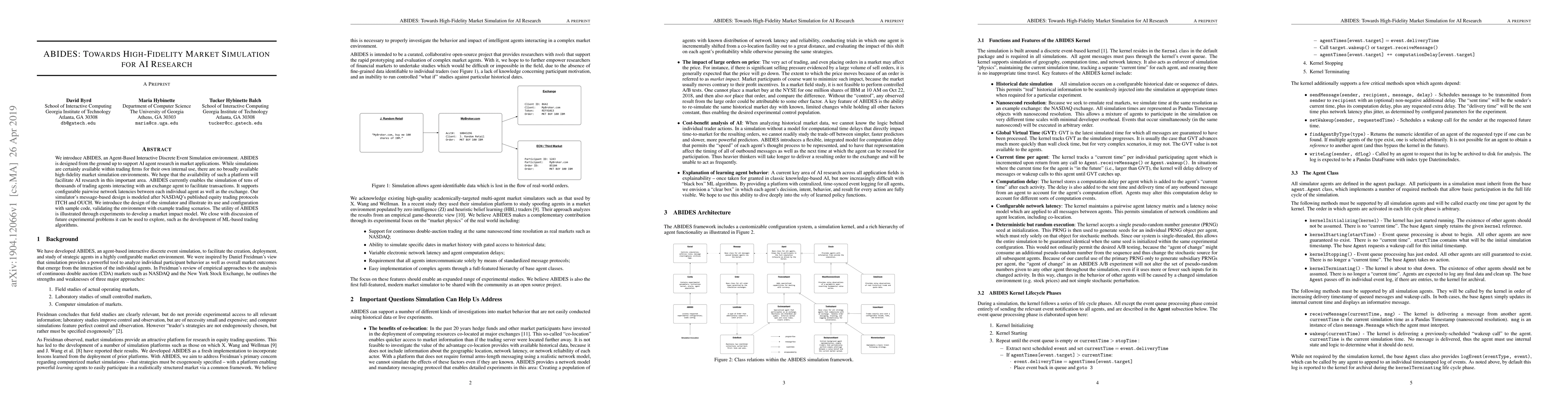 ABIDES is an Agent-Based Interactive Discrete Event Simulation environment designed for high-fidelity market simulations to support AI research in trading applications. It enables the simulation of numerous trading agents and supports configurable network latencies, modeled after NASDAQ's trading protocols.