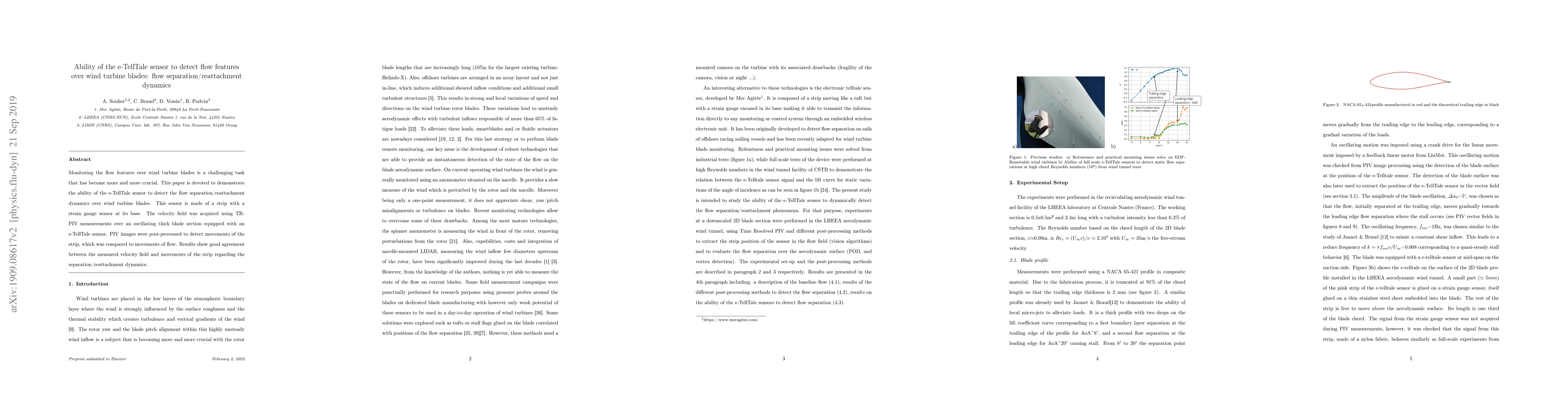 Monitoring the flow features over wind turbine blades is a challenging task that has become more and more crucial. This paper is devoted to demonstrate the ability of the e-TellTale sensor to detect the flow separation/reattachment dynamics over wind turbine blades. This sensor is made of a strip with a strain gauge sensor at its base. The velocity field was acquired using TR- PIV measurements over an oscillating thick blade section equipped with an e-TellTale sensor. PIV images were post-processed to detect movements of the strip, which was compared to movements of flow. Results show good agreement between the measured velocity field and movements of the strip regarding the separation/reattachment dynamics.