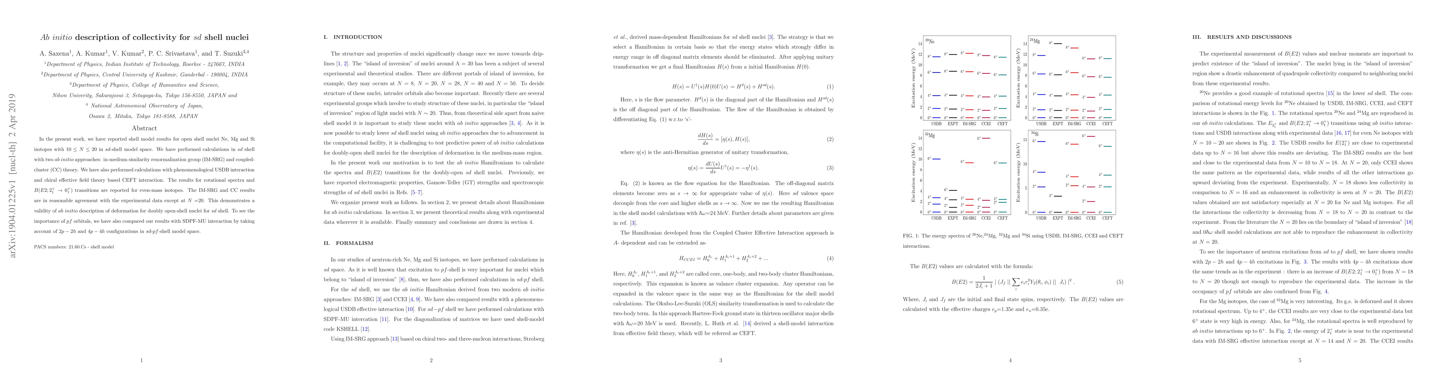 In the present work, we have reported shell model results for open shell nuclei Ne, Mg and Si isotopes with $10 \leq N \leq 20$ in $sd$-shell model space. We have performed calculations in $sd$ shell with two $ab~initio$ approaches: in-medium similarity renormalization group (IM-SRG) and coupled-cluster (CC) theory. We have also performed calculations with phenomenological USDB interaction and chiral effective field theory based CEFT interaction. The results for rotational spectra and $B(E2;2_1^+\rightarrow 0_1^+)$ transitions are reported for even-mass isotopes. The IM-SRG and CC results are in reasonable agreement with the experimental data except at $N$ =20. This demonstrates a validity of $ab~initio$ description of deformation for doubly open-shell nuclei for $sd$ shell. To see the importance of $pf$ orbitals, we have also compared our results with SDPF-MU interaction by taking account of $2p-2h$ and $4p-4h$ configurations in $sd$-$pf$-shell model space.