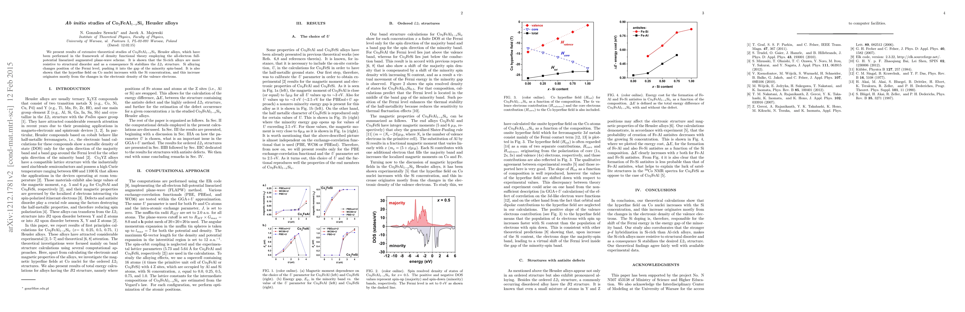 The study employs density functional theory to investigate Co$_2$FeAl$_{1-x}$Si$_x$ Heusler alloys, revealing that Si enhances structural stability and alters the Fermi level, while increasing the hyperfine field on Co nuclei due to changes in valence electron density.