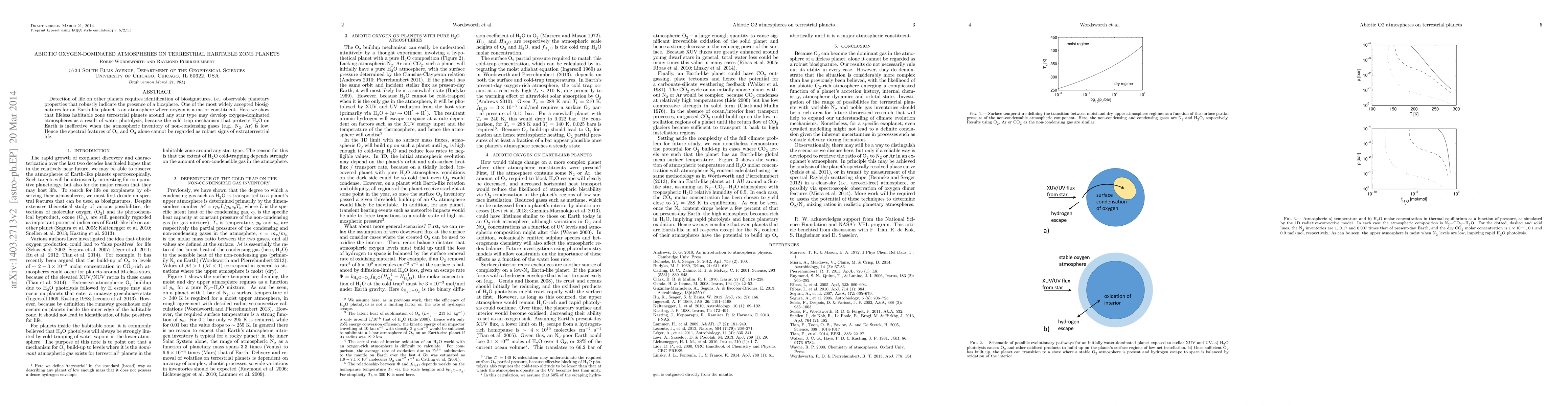 A combination of theoretical modeling and numerical simulations were used to investigate the formation and evolution of stable oxygen atmospheres on terrestrial planets.