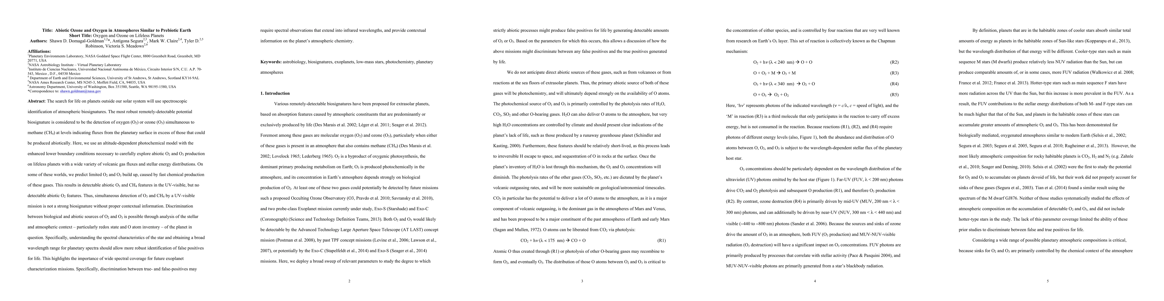 This study explores abiotic production of ozone and oxygen in atmospheres similar to prebiotic Earth using photochemical models. It finds that while abiotic ozone can be detectable, abiotic oxygen is not, complicating the use of oxygen and ozone detection as biosignatures without additional contextual information.