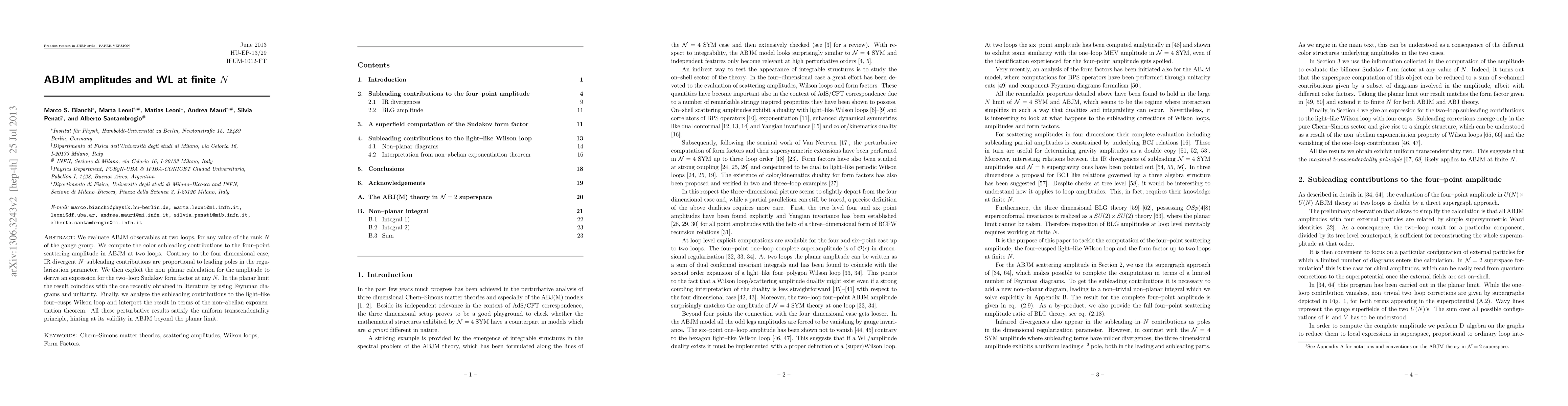 We evaluate ABJM observables at two loops, for any value of the rank N of the gauge group. We compute the color subleading contributions to the four-point scattering amplitude in ABJM at two loops. Contrary to the four dimensional case, IR divergent N-subleading contributions are proportional to leading poles in the regularization parameter. We then exploit the non-planar calculation for the amplitude to derive an expression for the two-loop Sudakov form factor at any N. In the planar limit the result coincides with the one recently obtained in literature by using Feynman diagrams and unitarity. Finally, we analyze the subleading contributions to the light-like four-cusps Wilson loop and interpret the result in terms of the non-abelian exponentiation theorem. All these perturbative results satisfy the uniform transcendentality principle, hinting at its validity in ABJM beyond the planar limit.