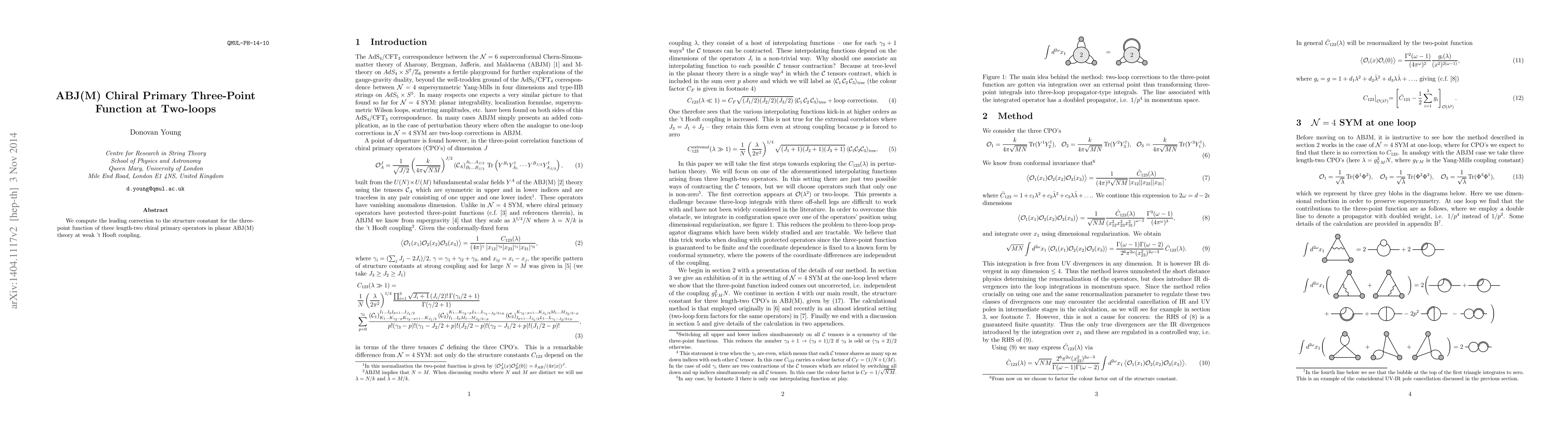 We compute the leading correction to the structure constant for the three-point function of length-two chiral primary operators in planar ABJ(M) theory at weak 't Hooft coupling.