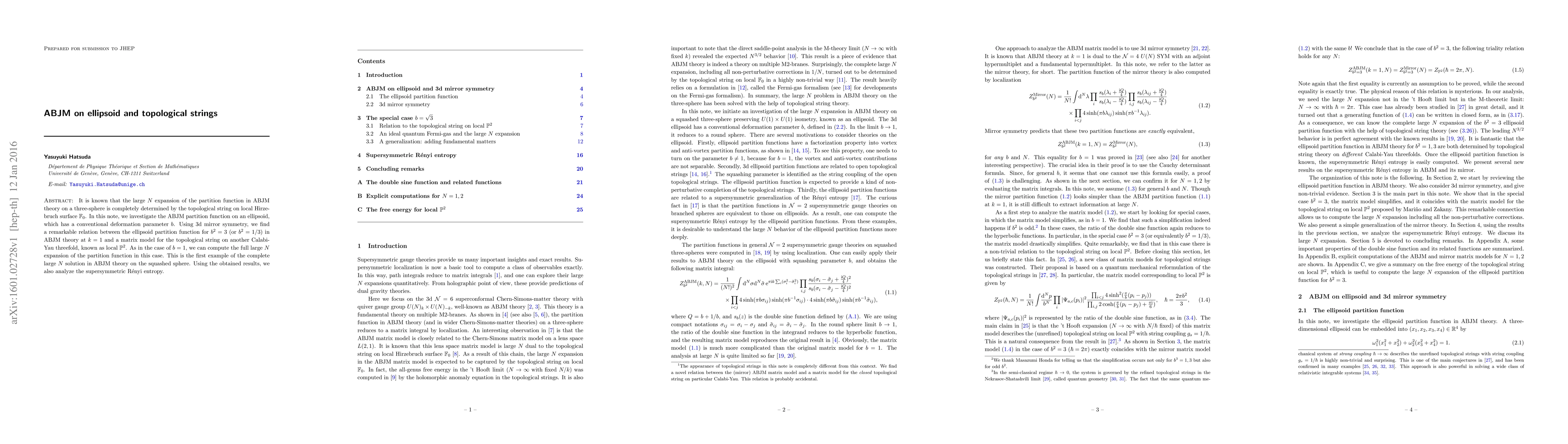 This paper explores the ABJM partition function on an ellipsoidal geometry, revealing a significant relation between the partition function for specific deformation parameters and a matrix model for the topological string on another Calabi-Yau threefold, local P^2. This establishes the first complete large N solution for ABJM theory on a squashed sphere and examines the supersymmetric Rényi entropy.