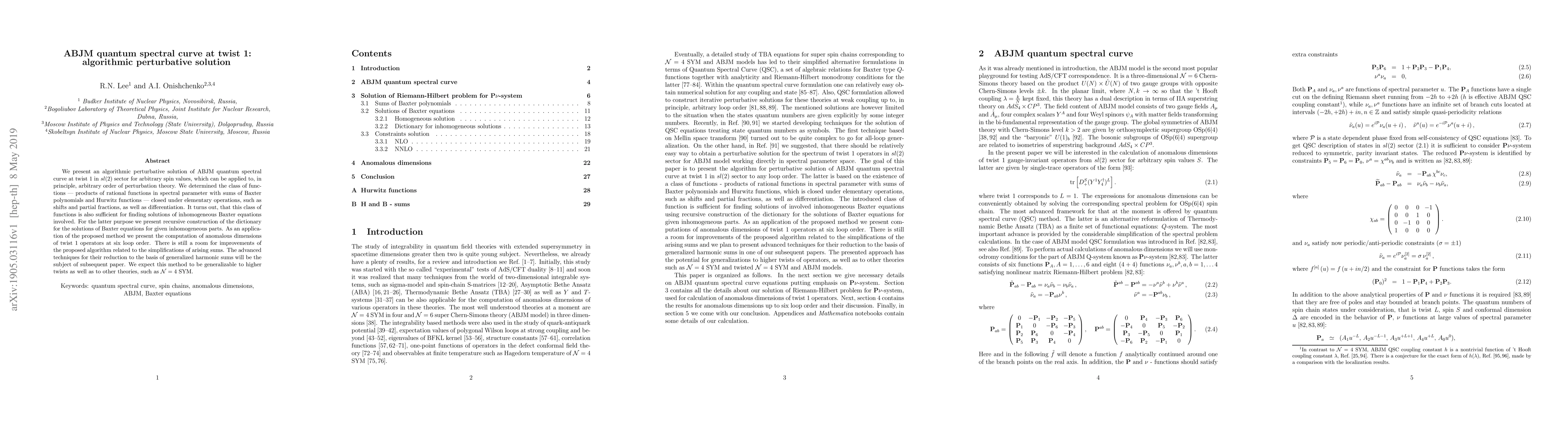 This paper proposes an algorithmic perturbative solution for the ABJM quantum spectral curve at twist 1, identifying a class of functions sufficient for solutions, and demonstrates its application in computing anomalous dimensions up to six loops. Future work aims to improve the simplification of arising sums and extend the method to higher twists and other theories.