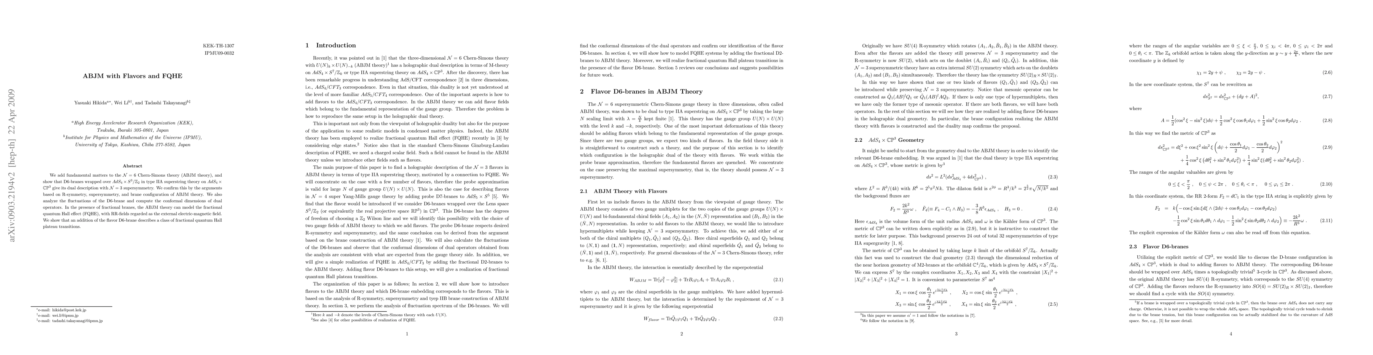 We add fundamental matters to the N=6 Chern-Simons theory (ABJM theory), and show that D6-branes wrapped over AdS_4 x S^3/Z_2 in type IIA superstring theory on AdS_4 x CP^3 give its dual description with N=3 supersymmetry. We confirm this by the arguments based on R-symmetry, supersymmetry, and brane configuration of ABJM theory. We also analyze the fluctuations of the D6-brane and compute the conformal dimensions of dual operators. In the presence of fractional branes, the ABJM theory can model the fractional quantum Hall effect (FQHE), with RR-fields regarded as the external electric-magnetic field. We show that an addition of the flavor D6-brane describes a class of fractional quantum Hall plateau transition.
