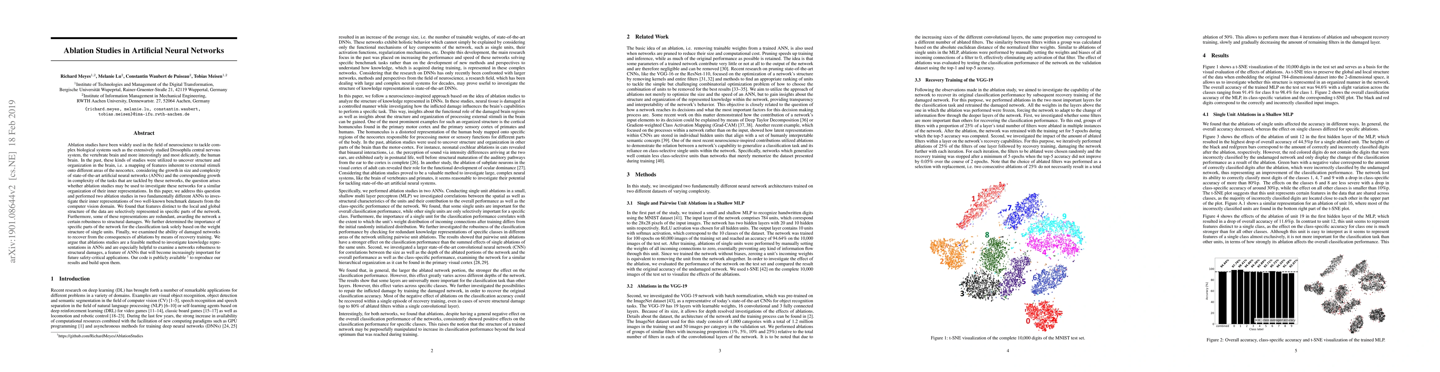 Ablation studies have been widely used in the field of neuroscience to tackle complex biological systems such as the extensively studied Drosophila central nervous system, the vertebrate brain and more interestingly and most delicately, the human brain. In the past, these kinds of studies were utilized to uncover structure and organization in the brain, i.e. a mapping of features inherent to external stimuli onto different areas of the neocortex. considering the growth in size and complexity of state-of-the-art artificial neural networks (ANNs) and the corresponding growth in complexity of the tasks that are tackled by these networks, the question arises whether ablation studies may be used to investigate these networks for a similar organization of their inner representations. In this paper, we address this question and performed two ablation studies in two fundamentally different ANNs to investigate their inner representations of two well-known benchmark datasets from the computer vision domain. We found that features distinct to the local and global structure of the data are selectively represented in specific parts of the network. Furthermore, some of these representations are redundant, awarding the network a certain robustness to structural damages. We further determined the importance of specific parts of the network for the classification task solely based on the weight structure of single units. Finally, we examined the ability of damaged networks to recover from the consequences of ablations by means of recovery training. We argue that ablations studies are a feasible method to investigate knowledge representations in ANNs and are especially helpful to examine a networks robustness to structural damages, a feature of ANNs that will become increasingly important for future safety-critical applications.