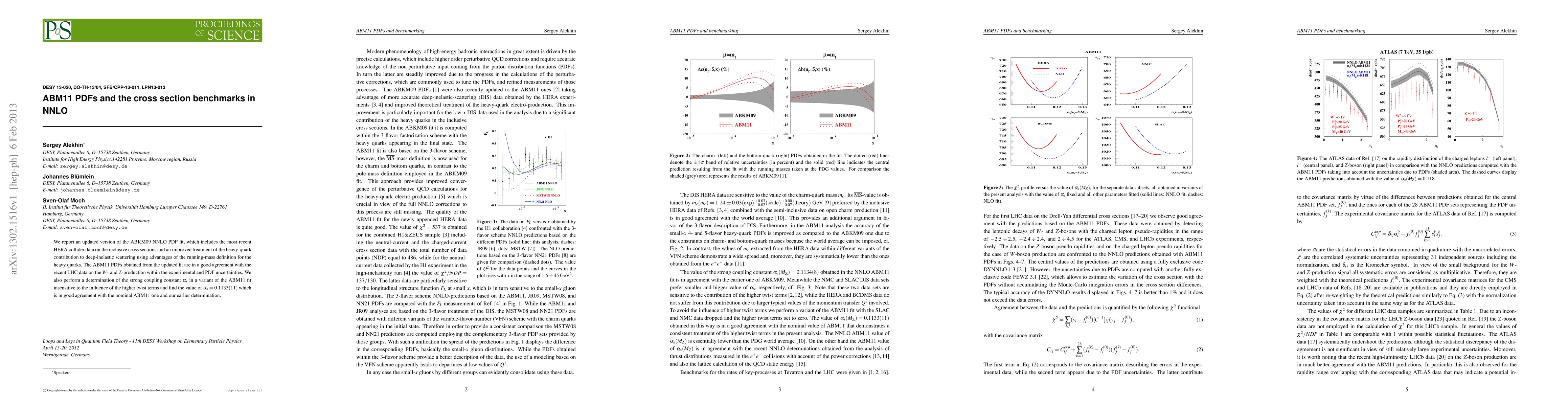 We report an updated version of the ABKM09 NNLO PDF fit, which includes the most recent HERA collider data on the inclusive cross sections and an improved treatment of the heavy-quark contribution to deep-inelastic scattering using advantages of the running-mass definition for the heavy quarks. The ABM11 PDFs obtained from the updated fit are in a good agreement with the recent LHC data on the W- and Z-production within the experimental and PDF uncertainties. We also perform a determination of the strong coupling constant \alpha_s in a variant of the ABM11 fit insensitive to the influence of the higher twist terms and find the value of \alpha_s=0.1133(11) which is in good agreement with the nominal ABM11 one and our earlier determination.