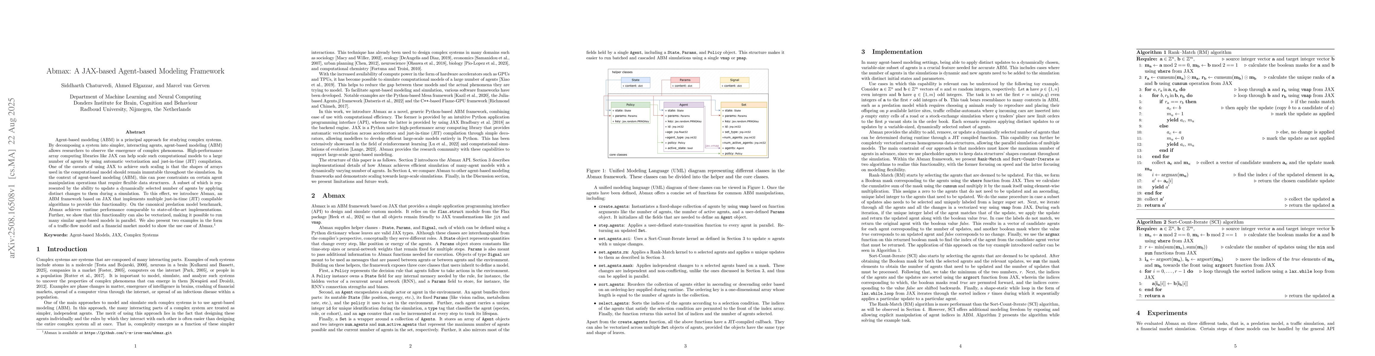 Agent-based modeling (ABM) is a principal approach for studying complex systems. By decomposing a system into simpler, interacting agents, agent-based modeling (ABM) allows researchers to observe the emergence of complex phenomena. High-performance array computing libraries like JAX can help scale such computational models to a large number of agents by using automatic vectorization and just-in-time (JIT) compilation. One of the caveats of using JAX to achieve such scaling is that the shapes of arrays used in the computational model should remain immutable throughout the simulation. In the context of agent-based modeling (ABM), this can pose constraints on certain agent manipulation operations that require flexible data structures. A subset of which is represented by the ability to update a dynamically selected number of agents by applying distinct changes to them during a simulation. To this effect, we introduce Abmax, an ABM framework based on JAX that implements multiple just-in-time (JIT) compilable algorithms to provide this functionality. On the canonical predation model benchmark, Abmax achieves runtime performance comparable to state-of-the-art implementations. Further, we show that this functionality can also be vectorized, making it possible to run many similar agent-based models in parallel. We also present two examples in the form of a traffic-flow model and a financial market model to show the use case of Abmax.