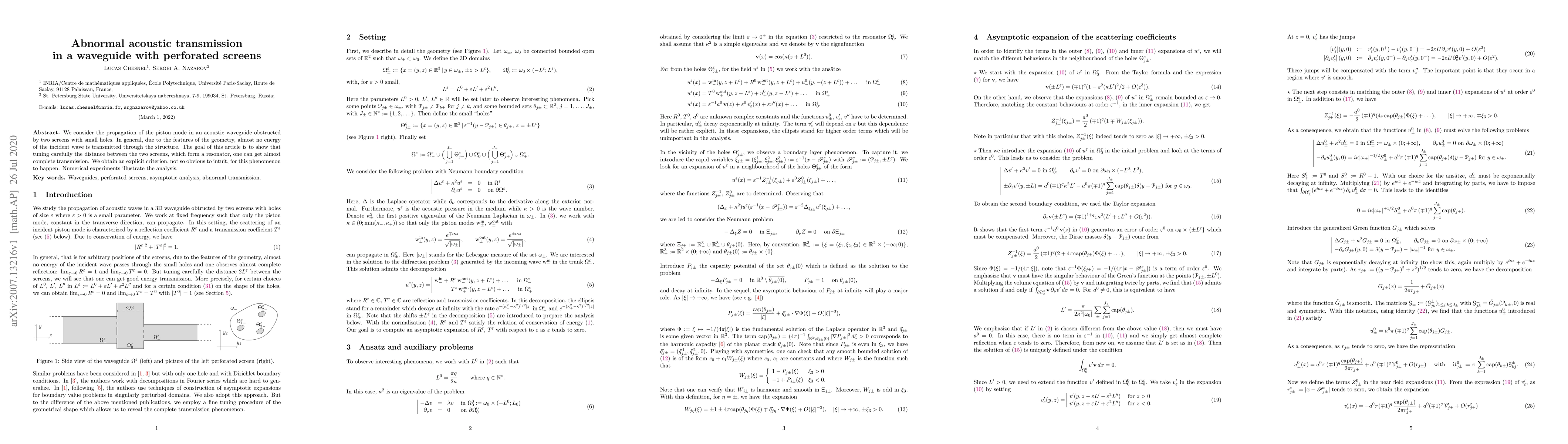 This study explores how adjusting the distance between two perforated screens in an acoustic waveguide can achieve almost complete transmission of piston mode waves, providing an explicit criterion for this phenomenon and supporting it with numerical experiments.