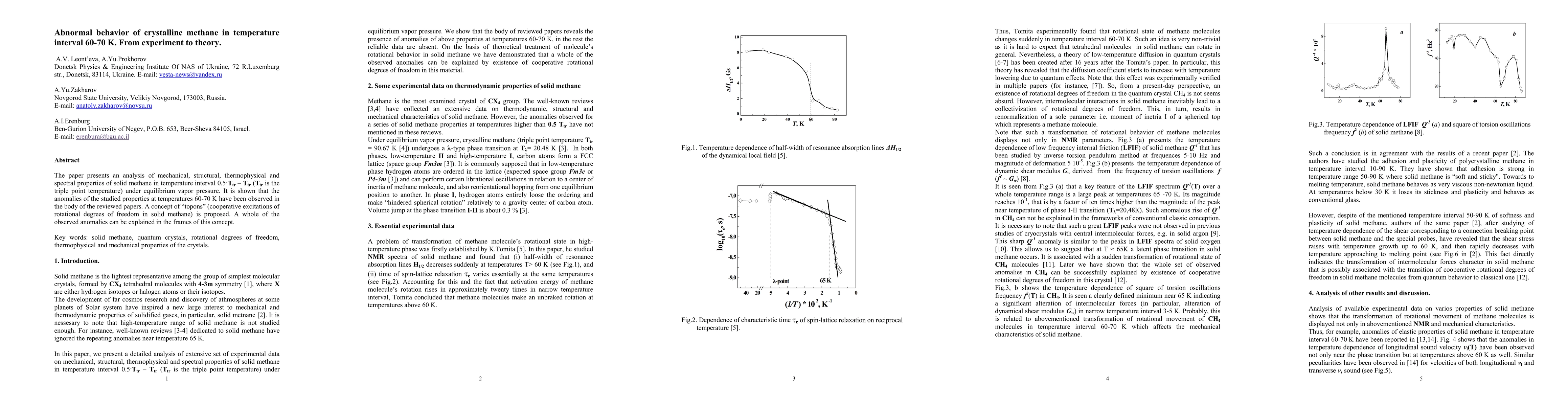 The study investigates the unusual mechanical, structural, thermophysical, and spectral properties of solid methane at temperatures between 60-70 K, identifying anomalies and proposing "topons" as collective excitations of rotational degrees of freedom to explain these phenomena. The concept of topons is presented as a theoretical framework to understand the observed anomalies.