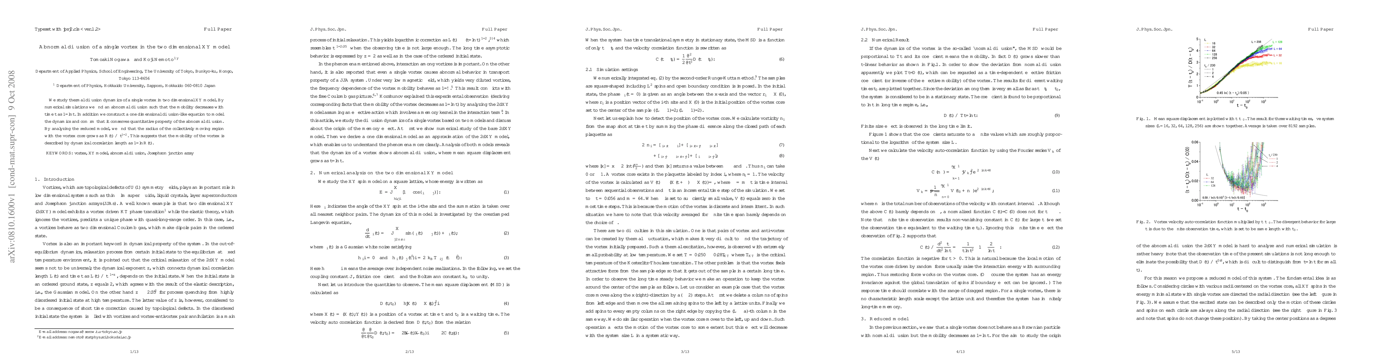 This paper investigates the thermal diffusion dynamics of a single vortex in the two-dimensional XY model, revealing abnormal diffusion where mobility decreases as $1/\ln t$. The study constructs a one-dimensional diffusion-like equation to model this behavior, showing that the radius of the region moving with the vortex core grows as $t^{1/2}$.