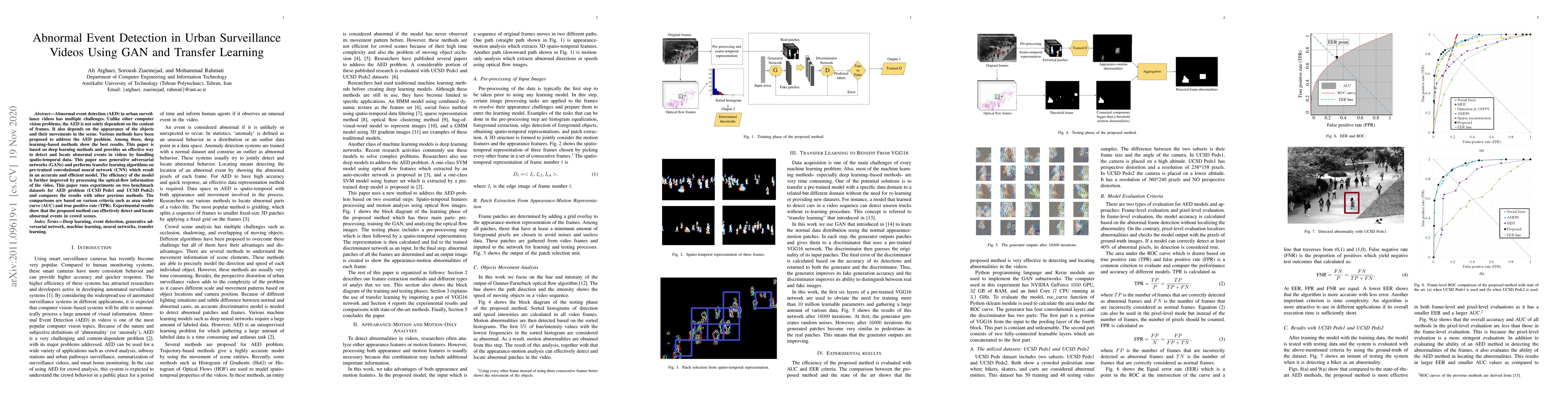 This paper uses a combination of GANs and transfer learning on pre-trained CNNs to detect and locate abnormal events in urban surveillance videos, achieving high accuracy and efficiency through optical flow processing. Experimental results on benchmark datasets show superior performance compared to previous methods in terms of AUC and TPR.