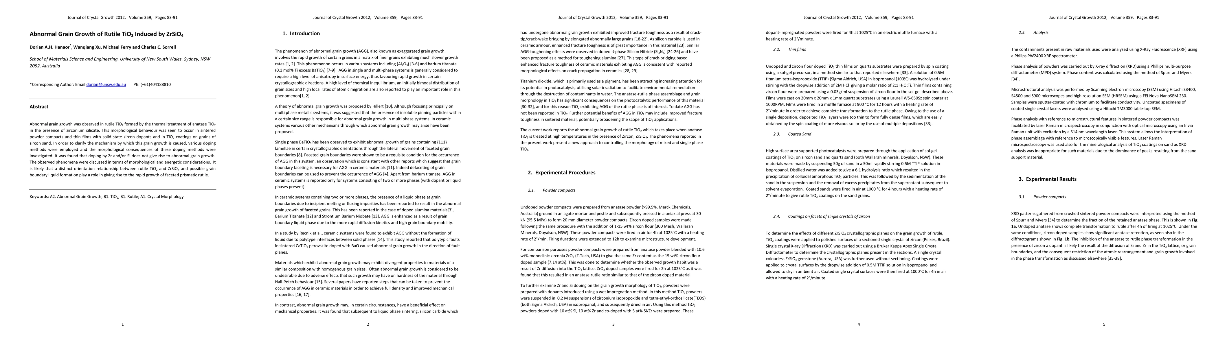 Abnormal grain growth (AGG) was observed in rutile TiO2 formed by the thermal treatment of anatase TiO2 in the presence of zirconium silicate. This morphological behaviour was seen to occur in sintered powder compacts and thin films with solid state zircon dopants and in TiO2 coatings on grains of zircon sand. In order to clarify the mechanism of AGG in this system, various doping methods were employed and the morphological consequences of these doping methods were investigated. It was found that doping by Zr and Si does not give rise to abnormal grain growth. The observed phenomena were discussed in terms of morphological and energetic considerations. It is likely that a distinct orientation relationship between rutile TiO2 and ZrSiO4 and possible grain boundary liquid formation play a role in giving rise to the rapid growth of faceted prismatic rutile.