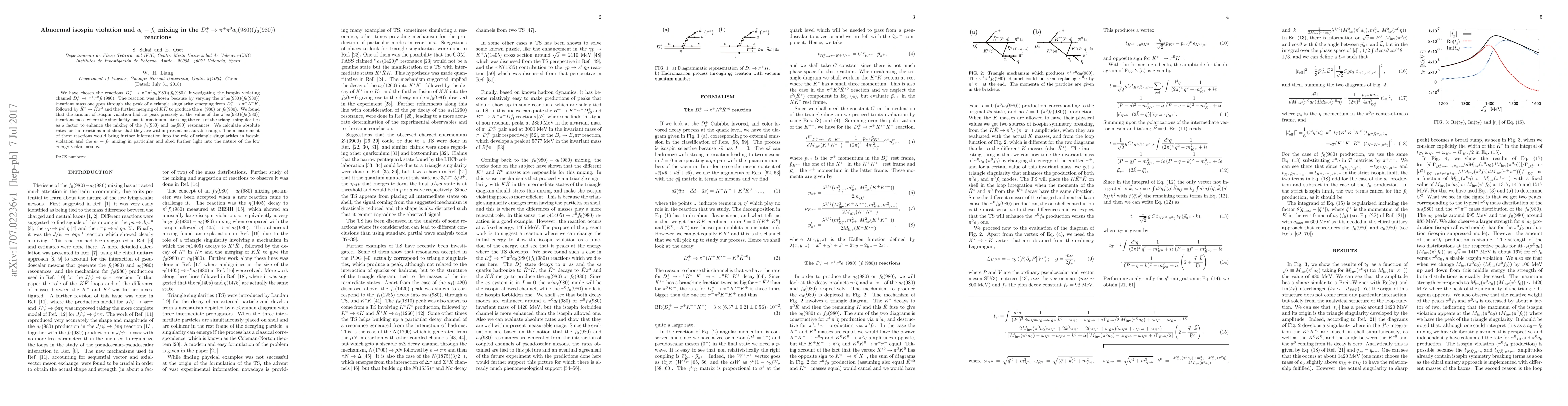 This paper investigates the $D_s^+ \to \pi^+ \pi^0 a_0(980) (f_0(980))$ reactions, focusing on isospin violation in the $D_s^+ \to \pi^+ \pi^0 f_0(980)$ channel. The study reveals that isospin violation peaks at the triangle singularity maximum, highlighting the role of these singularities in enhancing $a_0(980)$ and $f_0(980)$ resonance mixing.