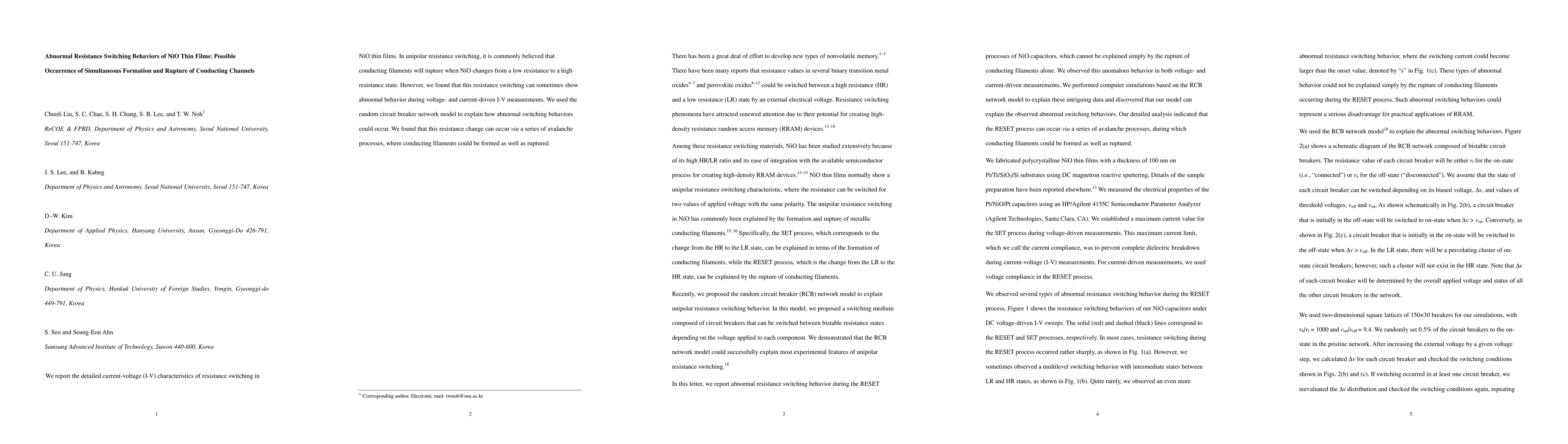 This paper investigates the unusual resistance switching behaviors in NiO thin films, revealing that conducting filaments can both form and rupture simultaneously during switching. The researchers propose a random circuit breaker network model to explain these anomalies, suggesting a series of avalanche processes drive the observed phenomena.