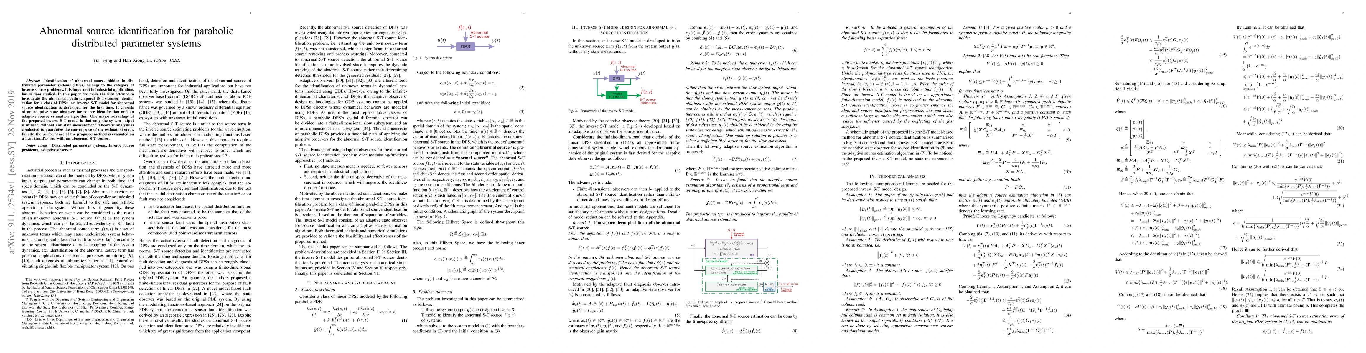 The paper develops an inverse spatio-temporal (S-T) model for abnormal source identification in distributed parameter systems (DPSs), utilizing an adaptive state observer and an adaptive source estimation algorithm, with theoretical analysis ensuring the convergence of the estimation error.