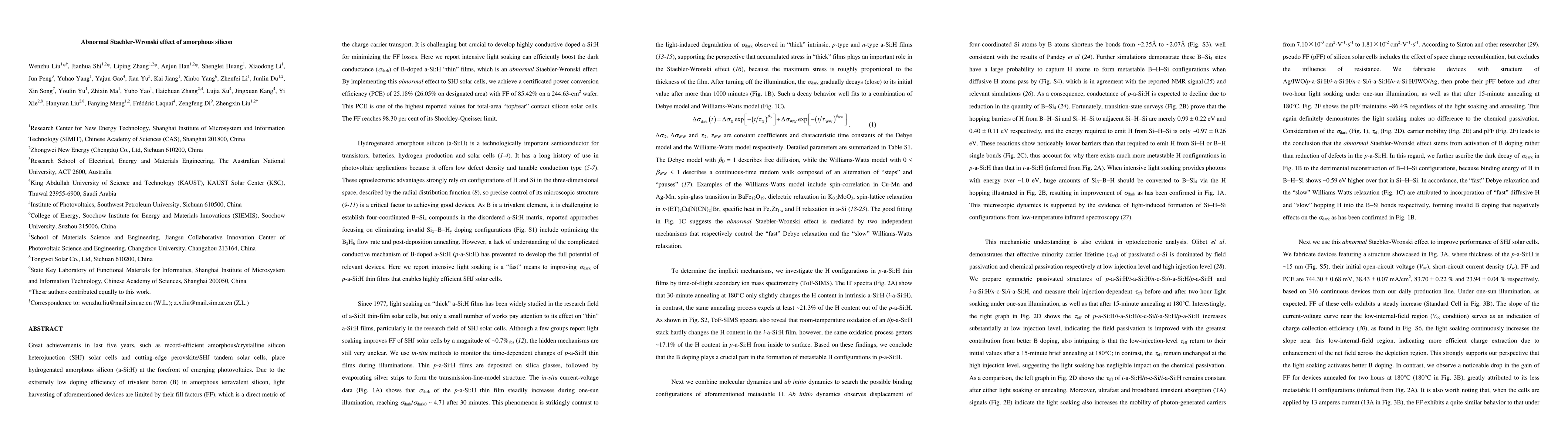 Great achievements in last five years, such as record-efficient amorphous/crystalline silicon heterojunction (SHJ) solar cells and cutting-edge perovskite/SHJ tandem solar cells, place hydrogenated amorphous silicon (a-Si:H) at the forefront of emerging photovoltaics. Due to the extremely low doping efficiency of trivalent boron (B) in amorphous tetravalent silicon, light harvesting of aforementioned devices are limited by their fill factors (FF), which is a direct metric of the charge carrier transport. It is challenging but crucial to develop highly conductive doped a-Si:H for minimizing the FF losses. Here we report intensive light soaking can efficiently boost the dark conductance of B-doped a-Si:H "thin" films, which is an abnormal Staebler-Wronski effect. By implementing this abnormal effect to SHJ solar cells, we achieve a certificated power conversion efficiency (PCE) of 25.18% (26.05% on designated area) with FF of 85.42% on a 244.63-cm2 wafer. This PCE is one of the highest reported values for total-area "top/rear" contact silicon solar cells. The FF reaches 98.30 per cent of its Shockley-Queisser limit.