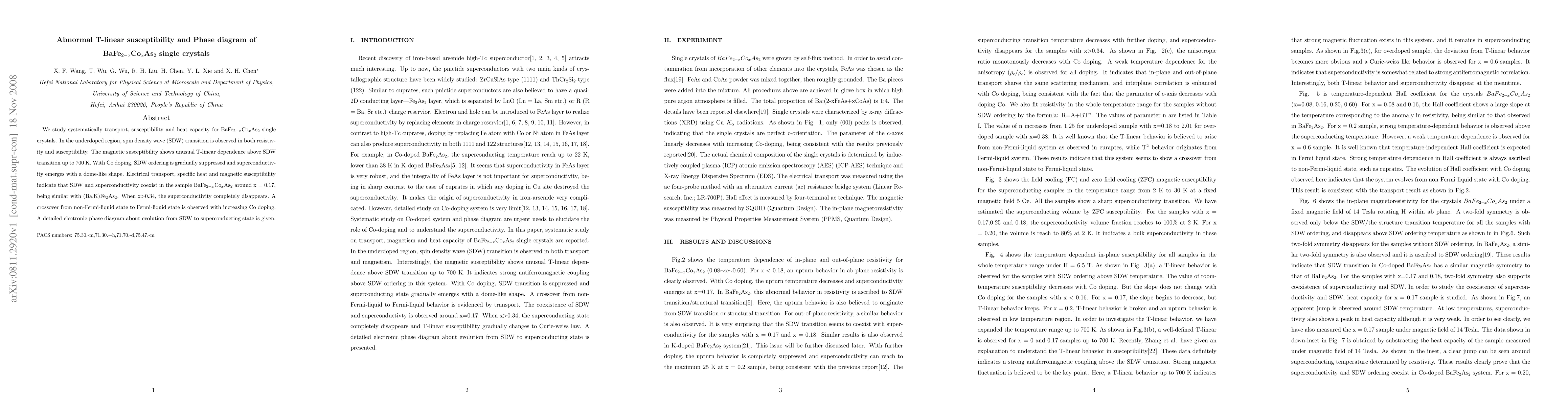 This study investigates the transport, susceptibility, and heat capacity of BaFe$_{2-x}$Co$_x$As$_2$ single crystals, revealing a T-linear magnetic susceptibility above the spin density wave transition and the emergence of superconductivity with Co doping, which coexists with SDW up to x = 0.17. The research provides a detailed phase diagram showing the transition from SDW to superconductivity and a crossover to a Fermi-liquid state.