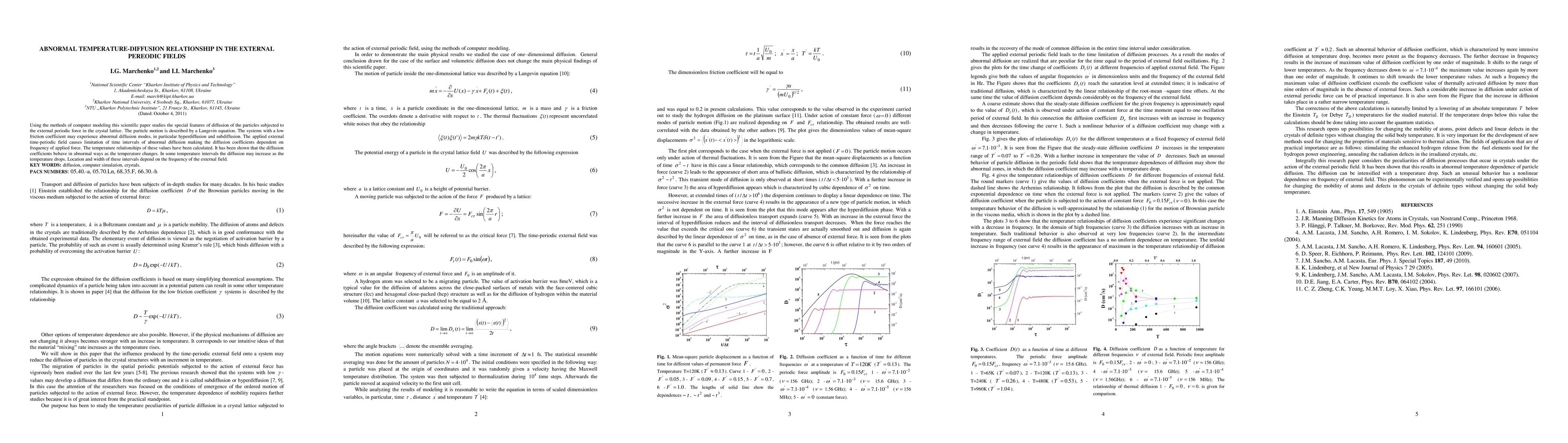This paper investigates the diffusion of particles in a crystal lattice under external periodic forces using computer modeling, revealing abnormal diffusion modes like hyperdiffusion and subdiffusion. It finds that the diffusion coefficients are frequency-dependent and exhibit unusual temperature-diffusion relationships, including instances where diffusion increases with decreasing temperature, influenced by the frequency of the applied external field.
