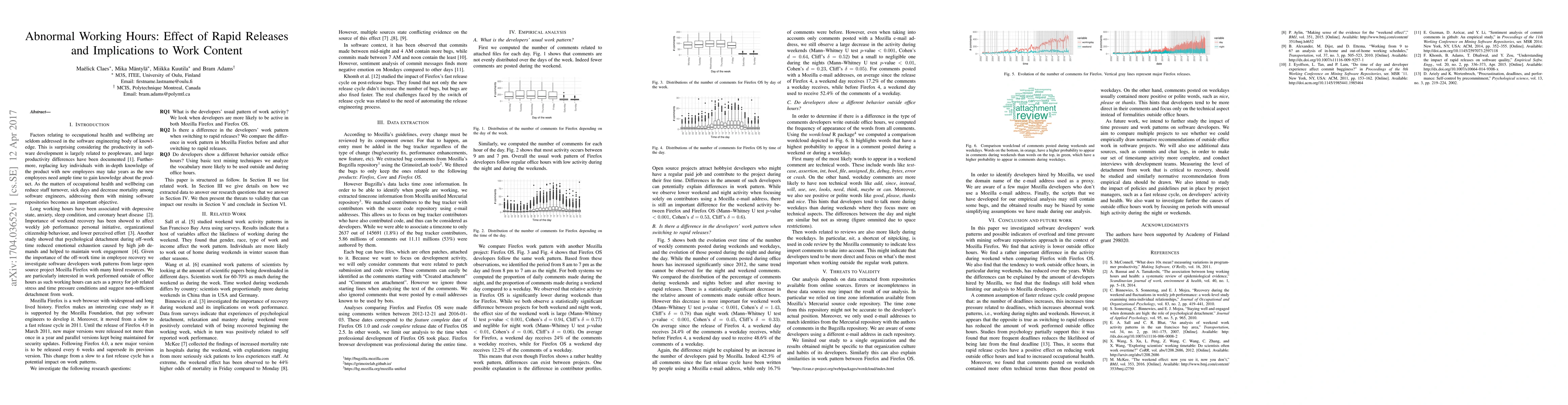 This paper examines the impact of rapid release cycles on the working patterns of software developers, finding that it reduces weekend and night work, potentially improving work-life balance. However, the study is limited to a single organization, suggesting further research is needed to generalize the findings.