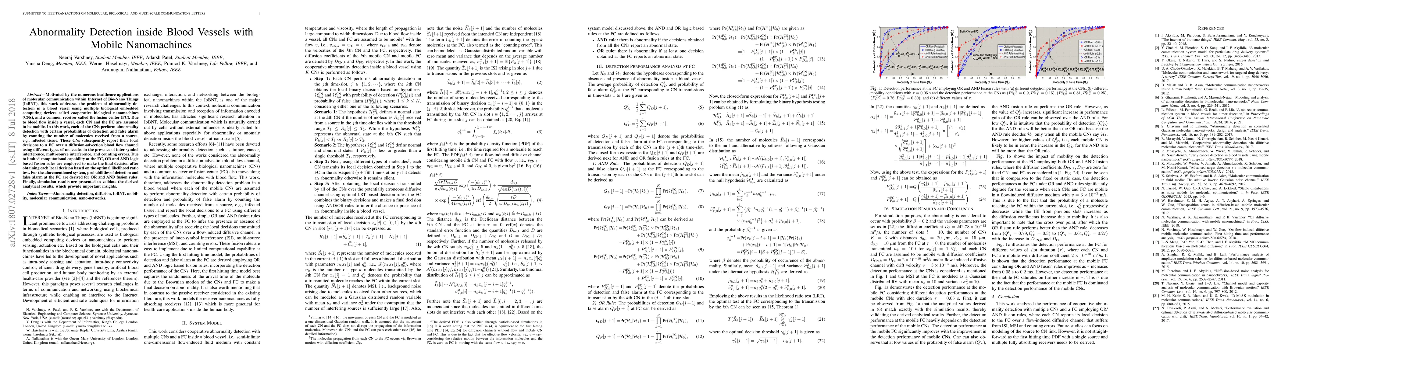 This paper explores the use of cooperative biological nanomachines (CNs) for detecting abnormalities in blood vessels, employing mobile nanomachines that communicate via molecular signals. The fusion center (FC) integrates these signals to make final detection decisions using OR and AND logic rules, with derived probabilities of detection and false alarm validated through simulations.