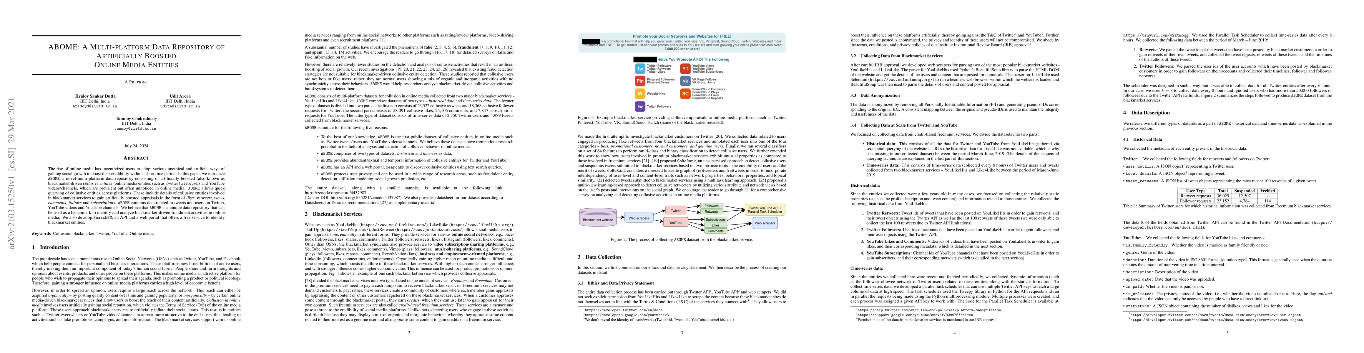 ABOME is a multi-platform data repository for artificially boosted online media entities, including Twitter and YouTube, aimed at identifying unethical practices for social growth. It also provides SearchBM, an API and web portal to detect blackmarket-driven fraudulent activities.