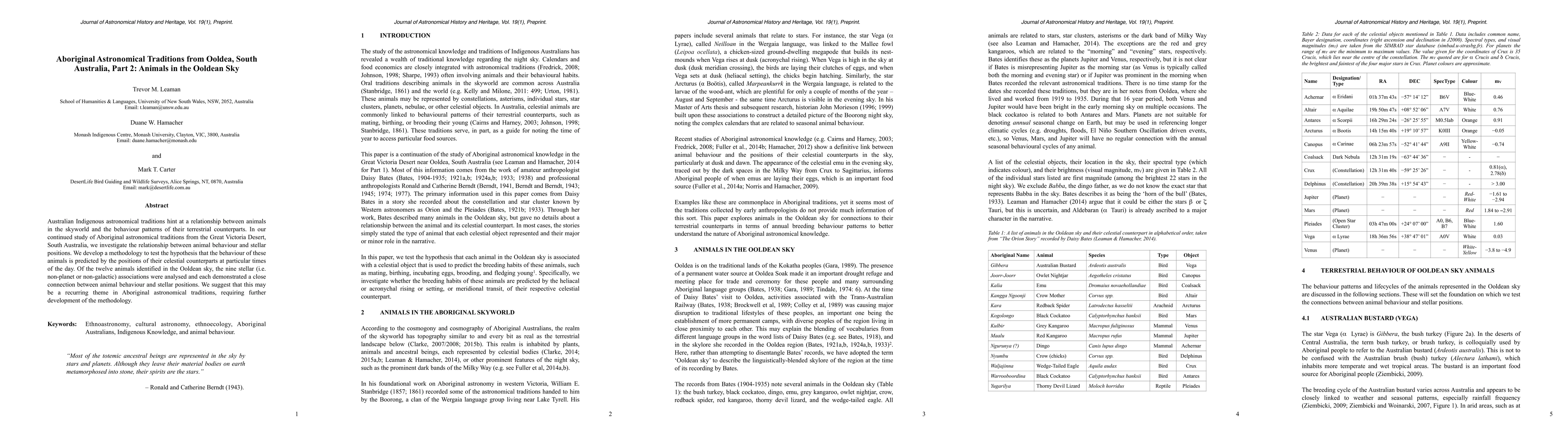 This study explores Aboriginal astronomical traditions in Ooldea, South Australia, focusing on the correlation between animal behavior and the positions of their celestial counterparts. The research confirms a strong link between the behavior of nine identified animals and their stellar positions, suggesting a broader theme in Aboriginal sky traditions.