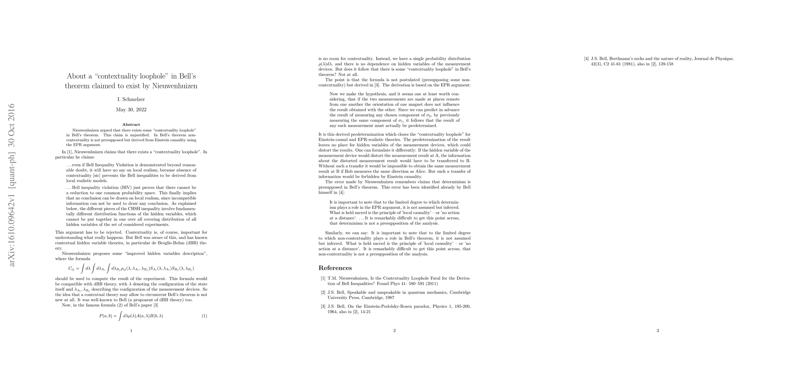 Summary: Nieuwenhuizen's claim of a "contextuality loophole" in Bell's theorem is unfounded; Bell's theorem does not presuppose but derives non-contextuality from Einstein causality via the EPR argument, refuting the existence of such a loophole.