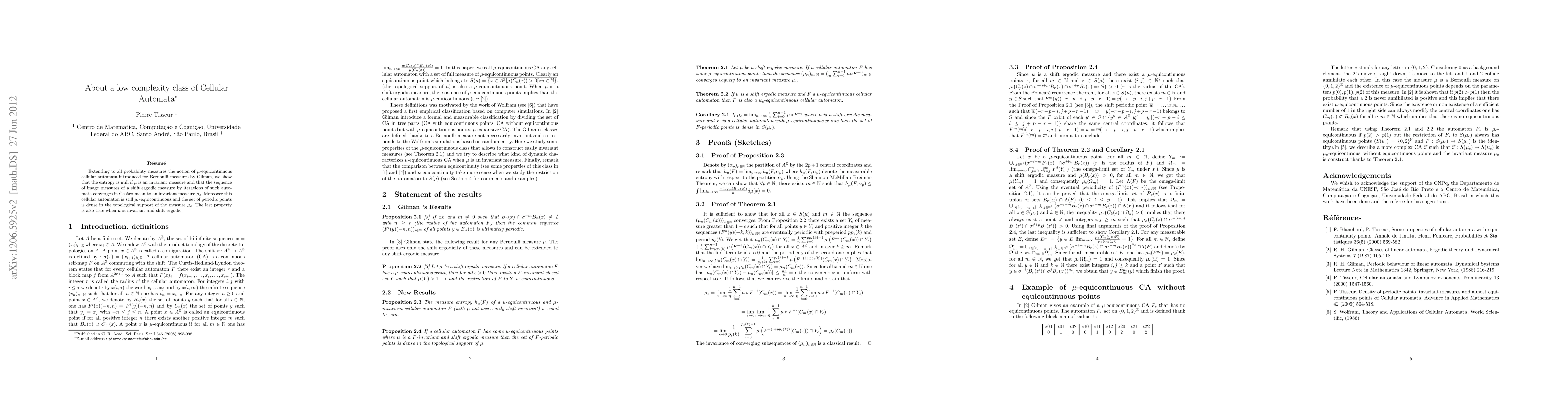 Extending to all probability measures the notion of m-equicontinuous cellular automata introduced for Bernoulli measures by Gilman, we show that the entropy is null if m is an invariant measure and that the sequence of image measures of a shift ergodic measure by iterations of such automata converges in Cesaro mean to an invariant measure mc. Moreover this cellular automaton is still mc-equicontinuous and the set of periodic points is dense in the topological support of the measure mc. The last property is also true when m is invariant and shift ergodic.