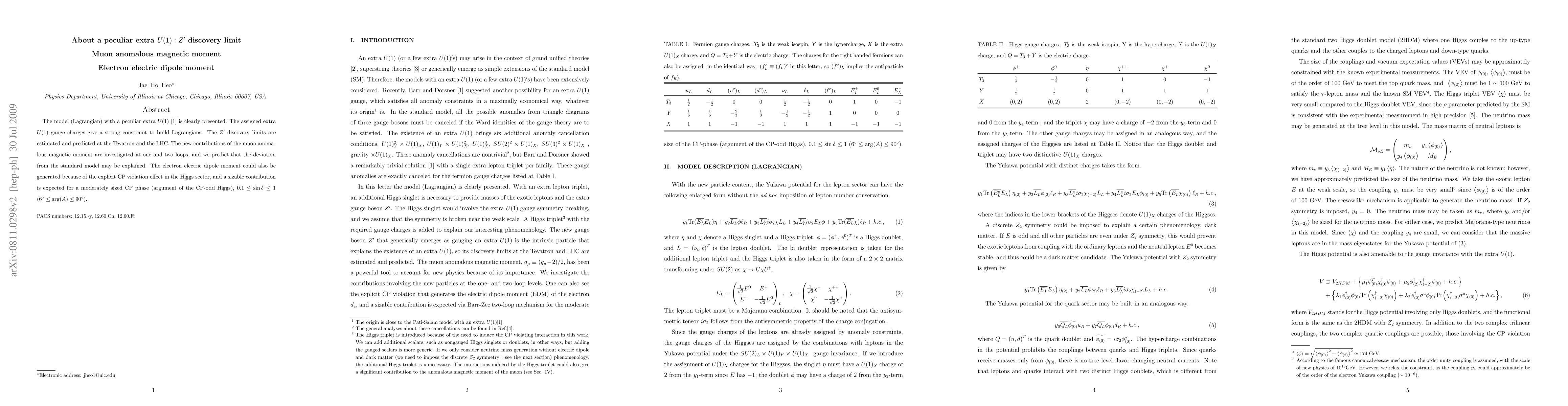 The model (Lagrangian) with a peculiar extra U(1)is clearly presented. The assigned extra U(1) gauge charges give a strong constraint to build Lagrangians. The Z' discovery limits are estimated and predicted at the Tevatron and the LHC. The new contributions of the muon anomalous magnetic moment are investigated at one and two loops, and we predict that the deviation from the standard model may be explained. The electron electric dipole moment could also be generated because of the explicit CP violation effect in the Higgs sector, and a sizable contribution is expected for a moderately sized CP phase(argument of the CP-odd Higgs).