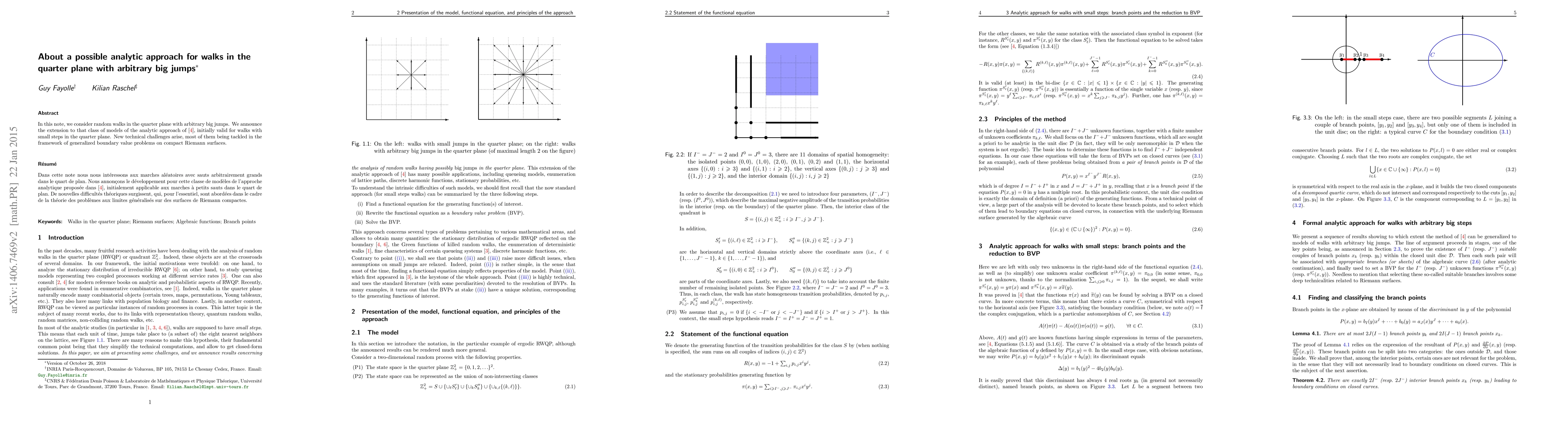 In this note, we consider random walks in the quarter plane with arbitrary big jumps. We announce the extension to that class of models of the analytic approach of [G. Fayolle, R. Iasnogorodski, and V. Malyshev, Random walks in the quarter plane, Springer-Verlag, Berlin (1999)], initially valid for walks with small steps in the quarter plane. New technical challenges arise, most of them being tackled in the framework of generalized boundary value problems on compact Riemann surfaces.