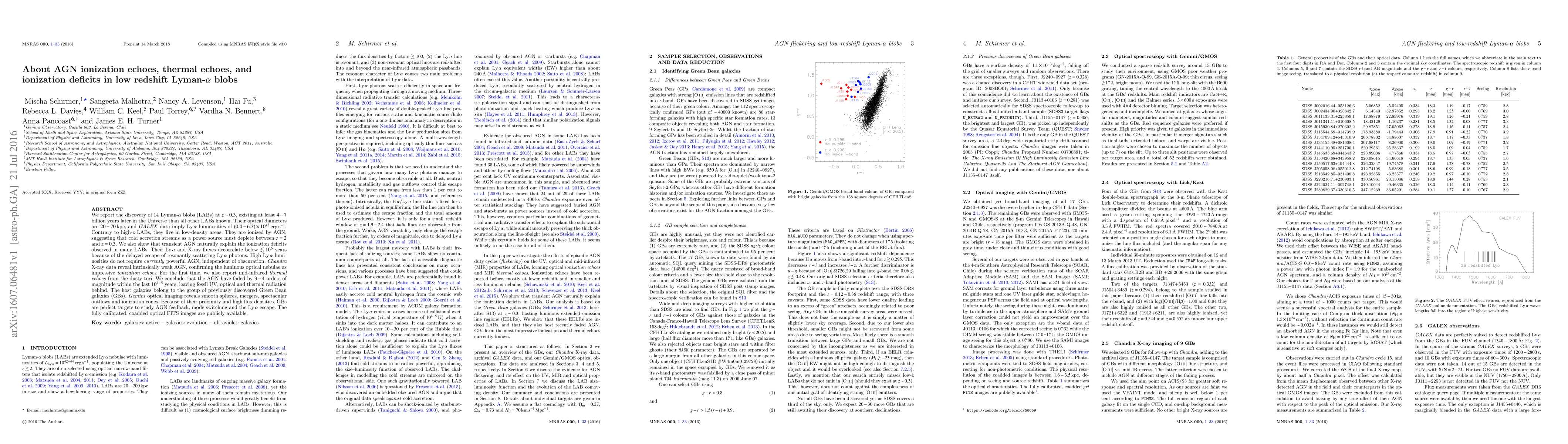 We report the discovery of 14 Lyman-alpha blobs (LABs) at z~0.3, existing at least 4-7 billion years later in the Universe than all other LABs known. Their optical diameters are 20-70 kpc, and GALEX data imply Ly-alpha luminosities of (0.4-6.3)x10^43 erg/s. Contrary to high-z LABs, they live in low-density areas. They are ionized by AGN, suggesting that cold accretion streams as a power source must deplete between z=2 and z=0.3. We also show that transient AGN naturally explain the ionization deficits observed in many LABs: Their Ly-alpha and X-ray fluxes decorrelate below 10^6 years because of the delayed escape of resonantly scattering Ly-alpha photons. High Ly-alpha luminosities do not require currently powerful AGN, independent of obscuration. Chandra X-ray data reveal intrinsically weak AGN, confirming the luminous optical nebulae as impressive ionization echoes. For the first time, we also report mid-infrared thermal echoes from the dusty tori. We conclude that the AGN have faded by 3-4 orders of magnitude within the last 10^(4-5) years, leaving fossil UV, optical and thermal radiation behind. The host galaxies belong to the group of previously discovered Green Bean galaxies (GBs). Gemini optical imaging reveals smooth spheres, mergers, spectacular outflows and ionization cones. Because of their proximity and high flux densities, GBs are perfect targets to study AGN feedback, mode switching and the Ly-alpha escape. The fully calibrated, coadded optical FITS images are publicly available.