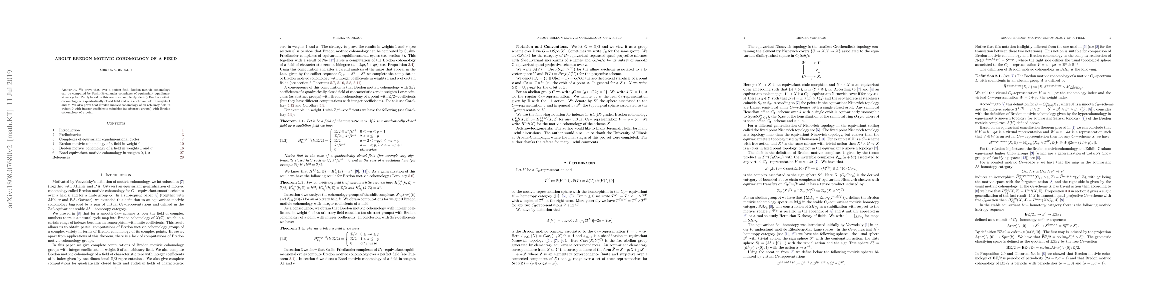 The paper proves that Bredon motivic cohomology over a perfect field can be computed using Suslin-Friedlander complexes of equivariant equidimensional cycles. It identifies Bredon motivic cohomology for quadratically closed and Euclidean fields in specific weights and shows that for arbitrary fields in weight 0, it matches Bredon cohomology of a point with integer coefficients.