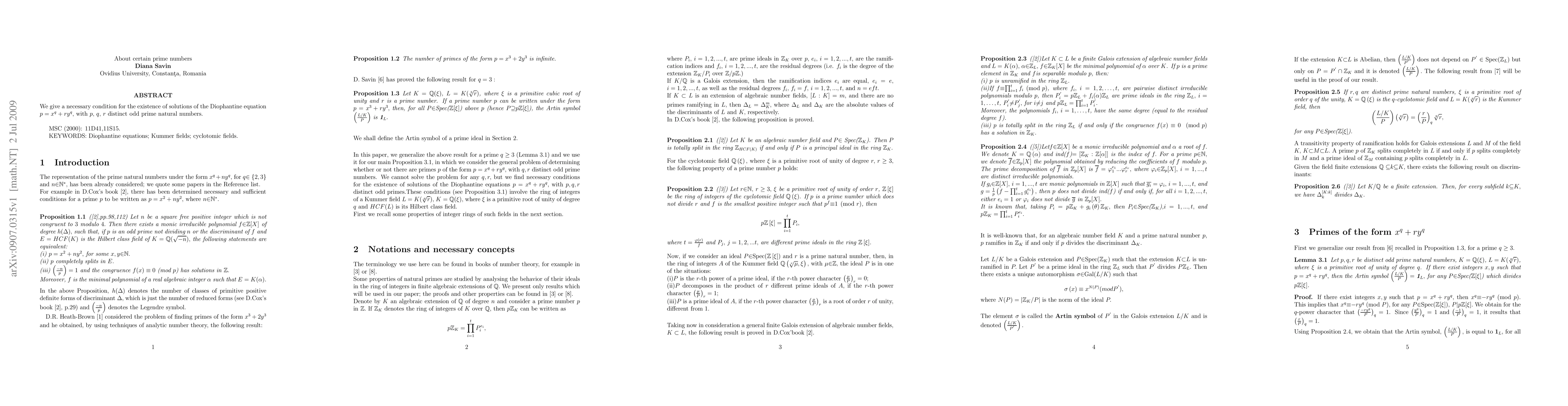 We give a necessary condition for the existence of solutions of the Diophantine equation $p=x^{q}+ry^{q},$ with $p$, $q$, $r$ distinct odd prime natural numbers.
