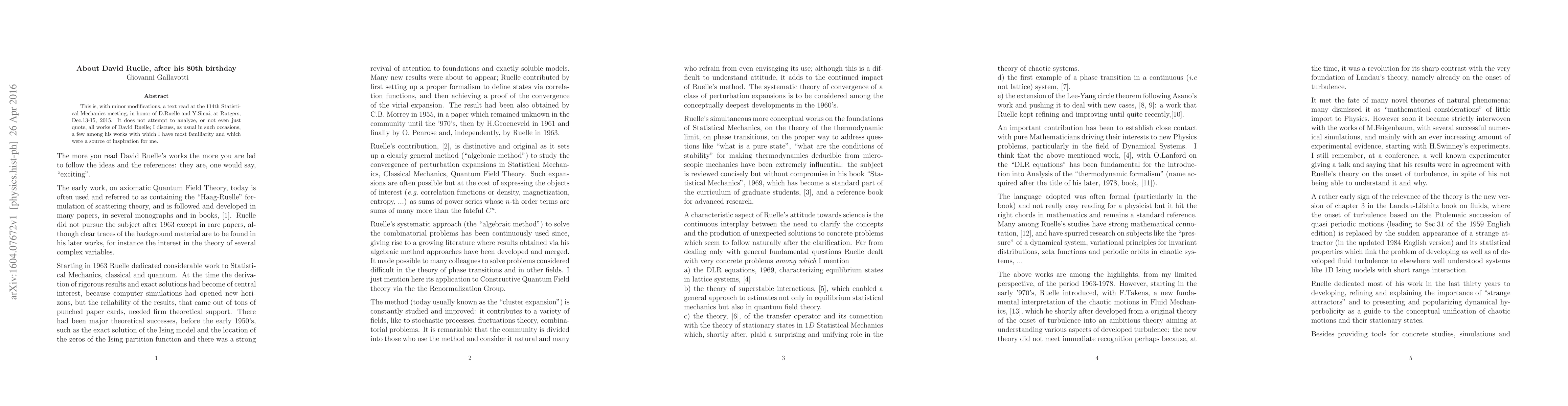 This paper commemorates David Ruelle on his 80th birthday, highlighting selected influential works that have inspired the author, presented at the 114th Statistical Mechanics meeting. It does not provide a comprehensive analysis of Ruelle's extensive body of work.