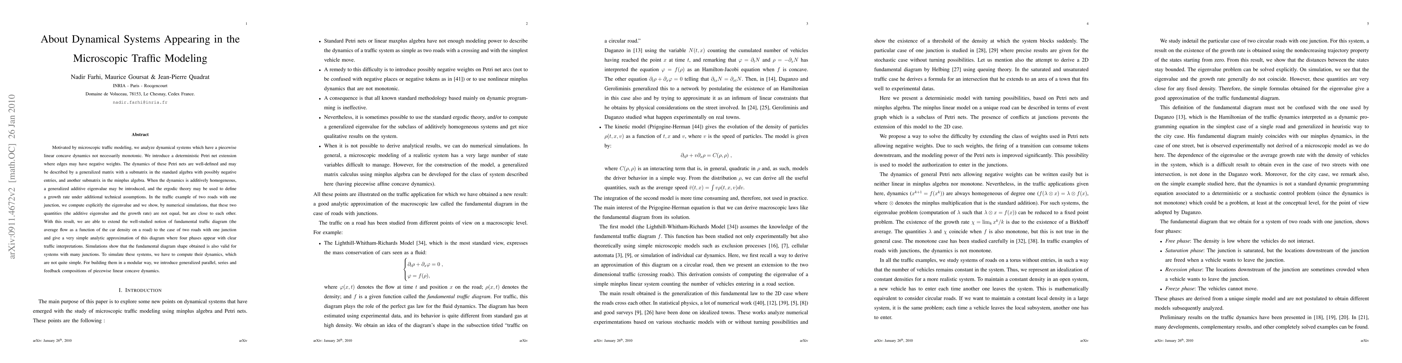 Motivated by microscopic traffic modeling, we analyze dynamical systems which have a piecewise linear concave dynamics not necessarily monotonic. We introduce a deterministic Petri net extension where edges may have negative weights. The dynamics of these Petri nets are well-defined and may be described by a generalized matrix with a submatrix in the standard algebra with possibly negative entries, and another submatrix in the minplus algebra. When the dynamics is additively homogeneous, a generalized additive eigenvalue may be introduced, and the ergodic theory may be used to define a growth rate under additional technical assumptions. In the traffic example of two roads with one junction, we compute explicitly the eigenvalue and we show, by numerical simulations, that these two quantities (the additive eigenvalue and the growth rate) are not equal, but are close to each other. With this result, we are able to extend the well-studied notion of fundamental traffic diagram (the average flow as a function of the car density on a road) to the case of two roads with one junction and give a very simple analytic approximation of this diagram where four phases appear with clear traffic interpretations. Simulations show that the fundamental diagram shape obtained is also valid for systems with many junctions. To simulate these systems, we have to compute their dynamics, which are not quite simple. For building them in a modular way, we introduce generalized parallel, series and feedback compositions of piecewise linear concave dynamics.