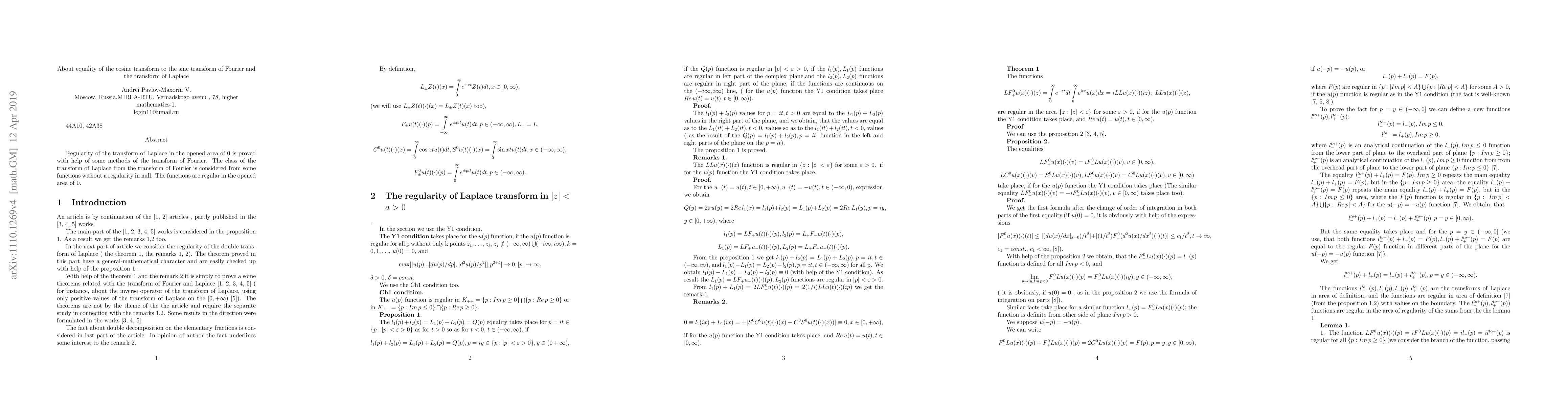 Regularity of the transform of Laplace in the opened area of 0 is proved with help of some methods of the transform of Fourier. The class of the transform of Laplace from the transform of Fourier is considered from some functions without a regularity in null. The functions are regular in the opened area of 0.