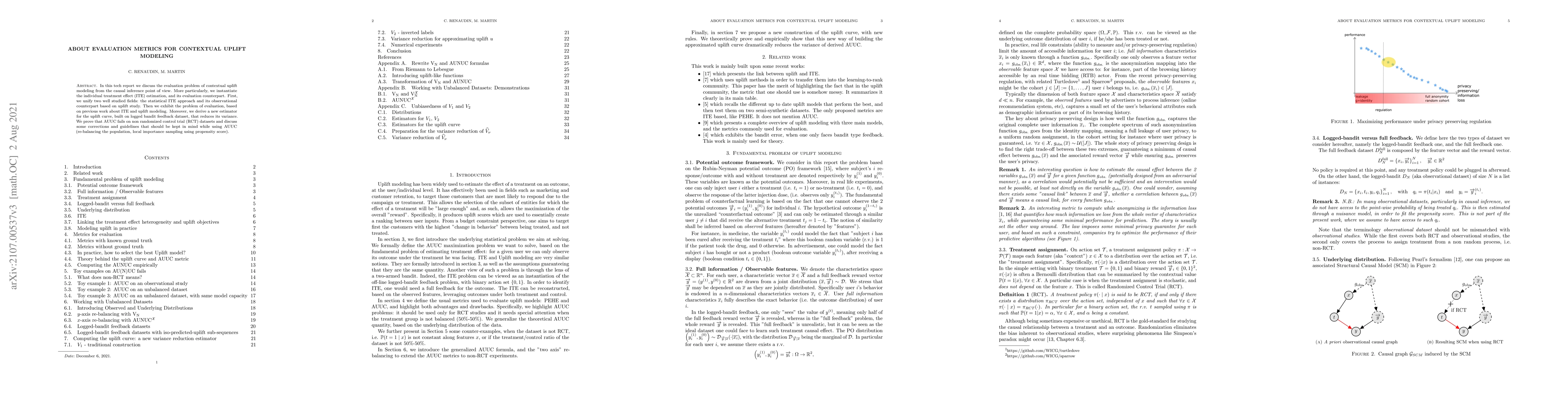 In this tech report we discuss the evaluation problem of contextual uplift modeling from the causal inference point of view. More particularly, we instantiate the individual treatment effect (ITE) estimation, and its evaluation counterpart. First, we unify two well studied fields: the statistical ITE approach and its observational counterpart based on uplift study. Then we exhibit the problem of evaluation, based on previous work about ITE and uplift modeling. Moreover, we derive a new estimator for the uplift curve, built on logged bandit feedback dataset, that reduces its variance. We prove that AUUC fails on non randomized control trial (RCT) datasets and discuss some corrections and guidelines that should be kept in mind while using AUUC (re-balancing the population, local importance sampling using propensity score).